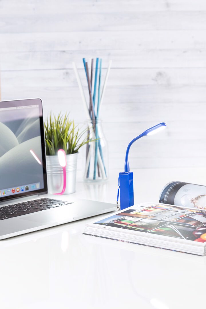 6 LED lamp with flexible arm and USB power supply. In an original bicolor design with a soft finish and presented in an attractive design box. 6 Leds. Flexible