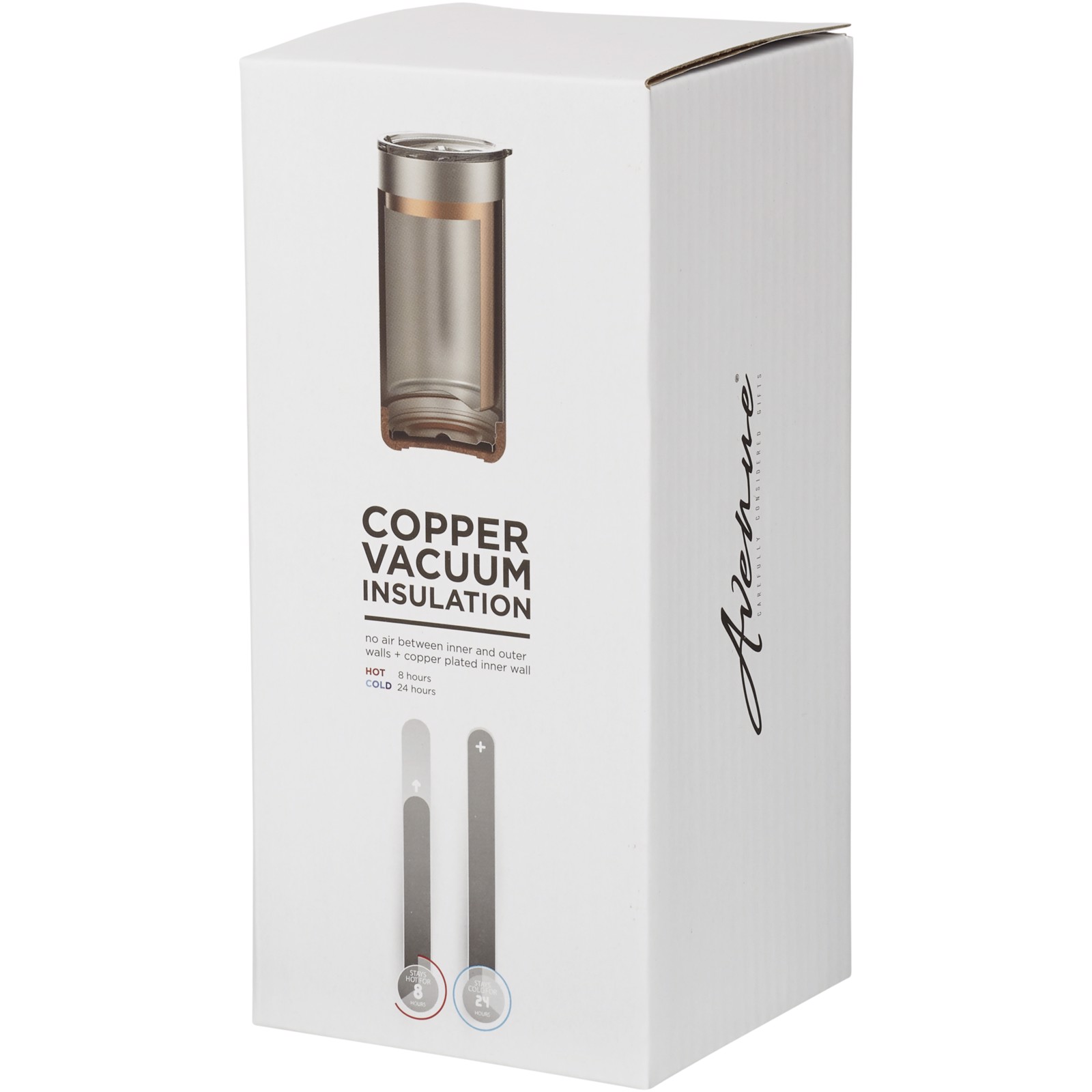 Tumbler featuring an on trend and skid-proof cork design base. Double-walled stainless steel vacuum construction, with copper insulation, this tumbler will keep your beverage cold for 24 hours and hot for at least 8 hours. The construction also prevents condensation developing on the outside. Volume capacity is 500 ml. Presented in an Avenue gift box.