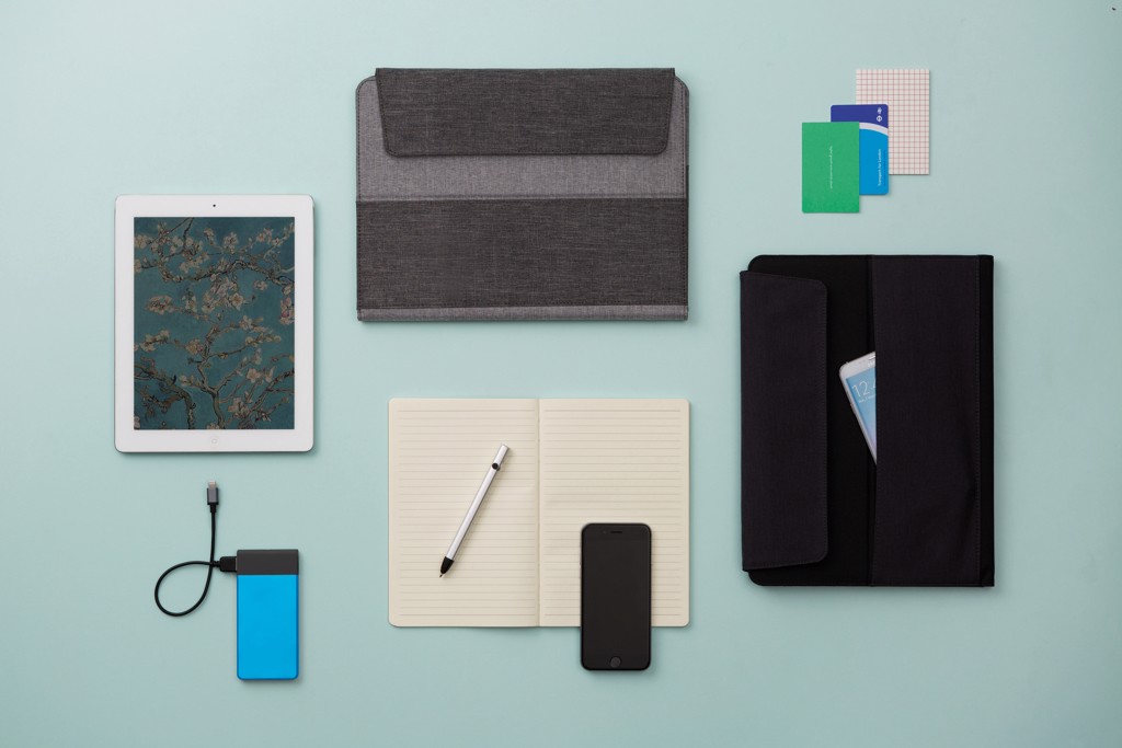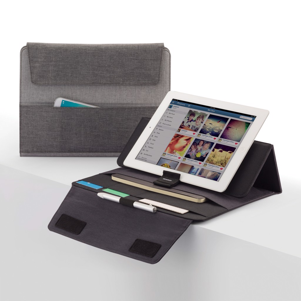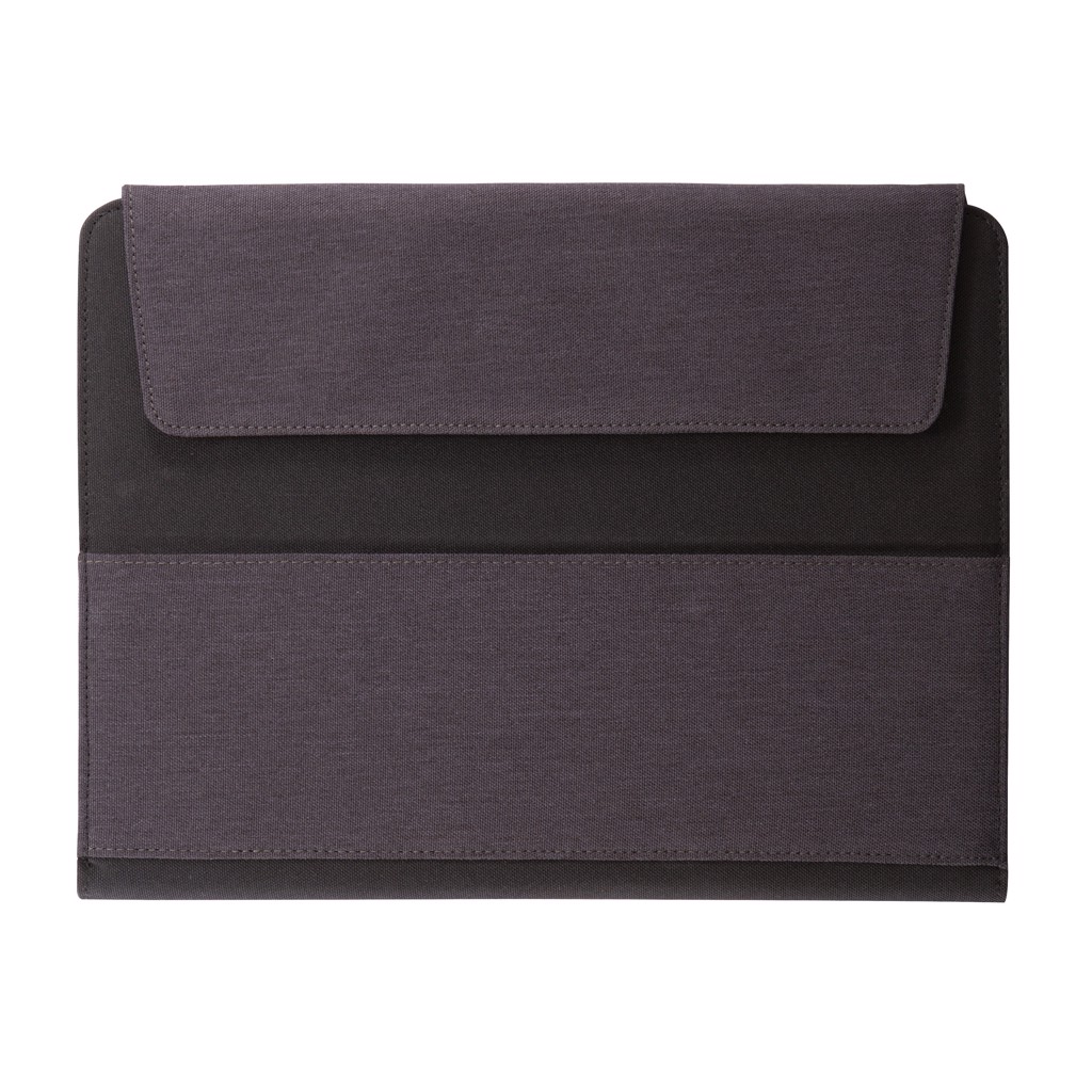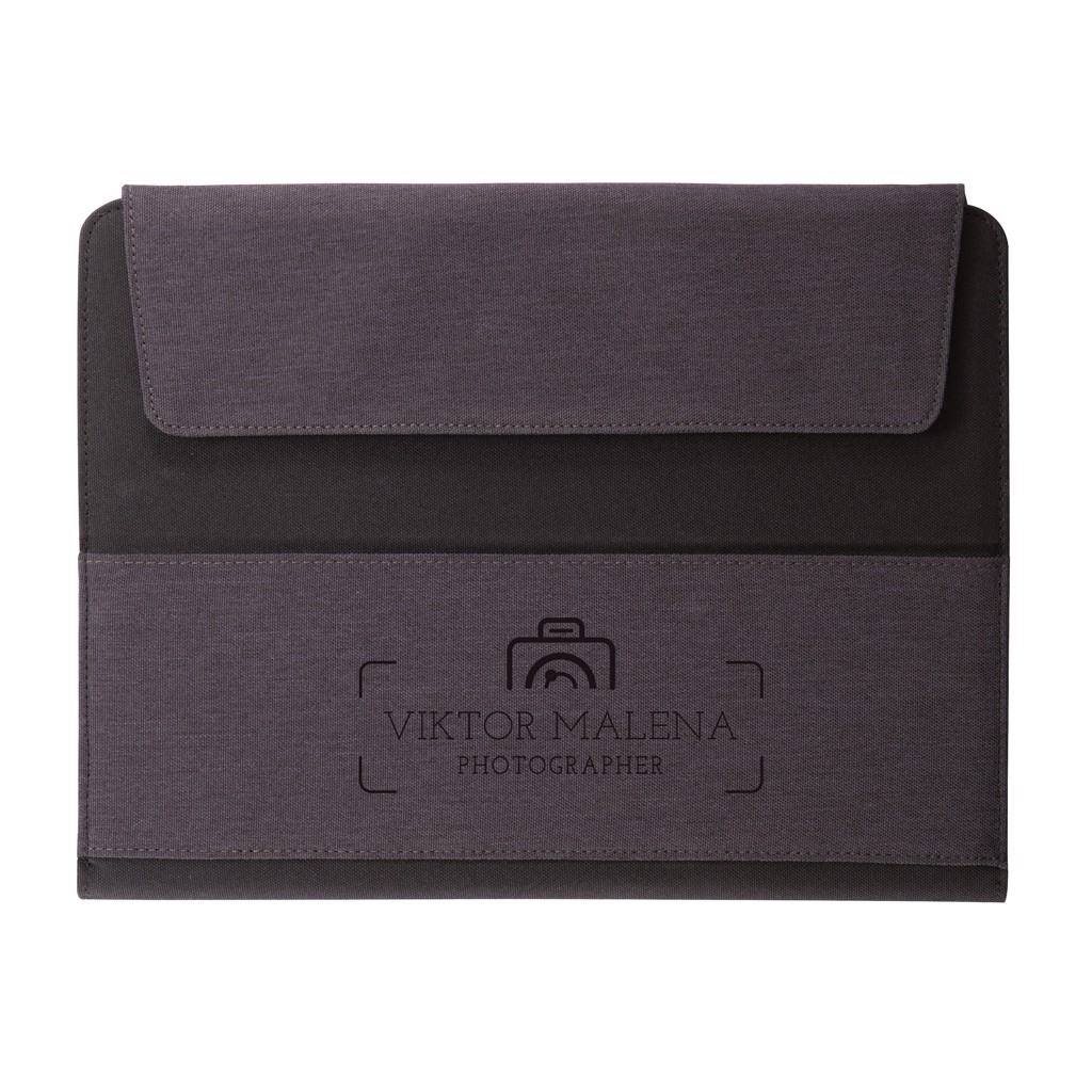 Vancouver makes it possible to work anywhere. It’s a compact yet multifunctional solution with pockets on both the outside and inside for all your daily essentials. The strong velcro closures secure all your belongings safely. There is a dedicated tablet pocket (max 10” tablets) with soft finish inside to protect your screen. This pocket can be transformed quickly to stand your tablet and start working. The fabric portfolio comes including an A5 notebook with 128 cream pages of 70g/m2. Registered design®