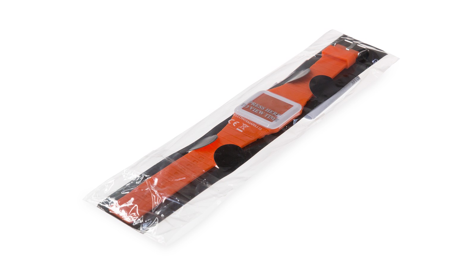 Digital wristwatch with red LED digits, activated by touching display. Ultra slim unibody design in soft and comfortable silicone. With printing area below the digits. Presented in an individual bag with inside cardboard reinforcement. Ultra Slim