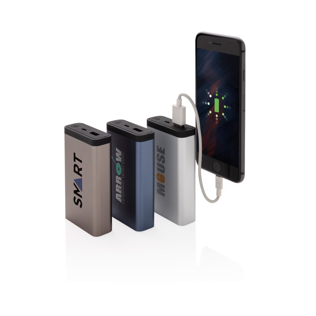 Strong and compact 10.000 mAh powerbank made out of durable aluminium that fits into your pocket so perfectly that you can take it wherever you go. When fully charged it will provide you with enough energy to re-charge your mobile phone up to five times. The powerbank contains a long lasting grade A 10.000 mAh high-density lithium polymer battery. The power indicators will indicate the remaining energy level so you always know when to re-charge. Input: 5V/2A. Output 5V/2A.