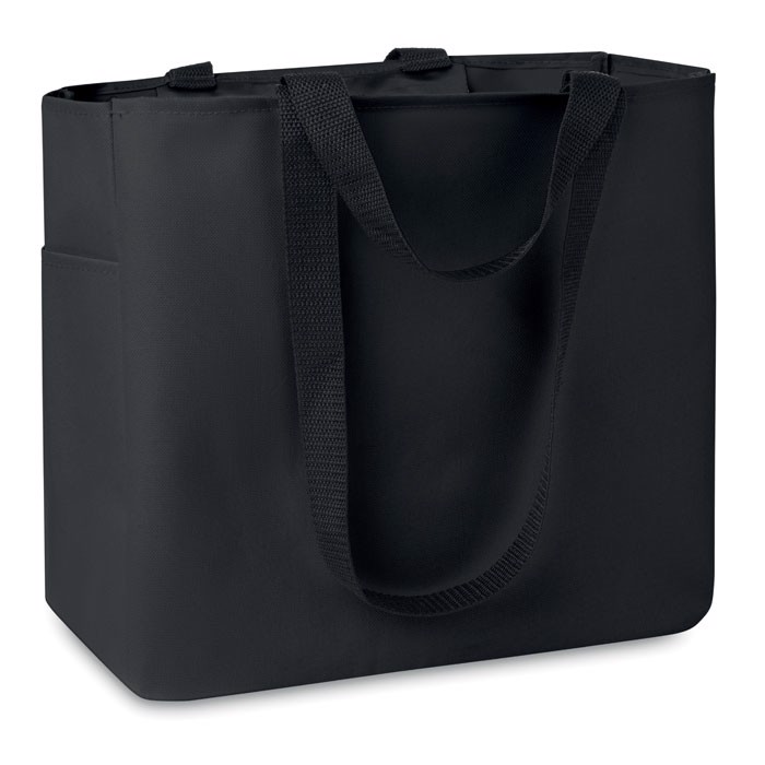 Shopping bag in 600D polyester with side pocket and inside zippered pocket. Long and short handles.
