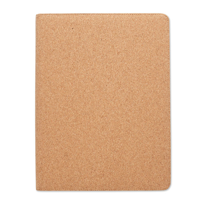A4 cork conference folder. Refillable A4 notepad. 30 recycled paper lined sheets. Matching pen and pen holder. 2 card holders and one large compartment.