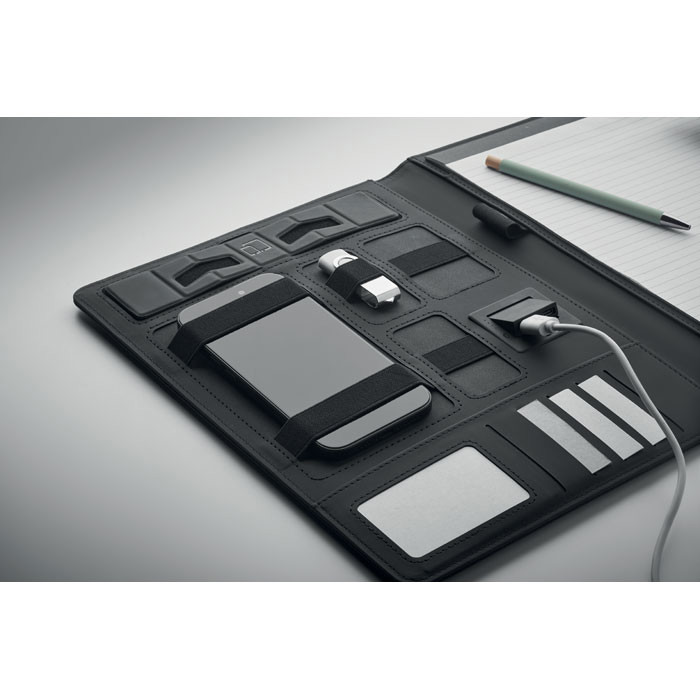 A4 conference folder with linen-PU cover. 5000 mAh power bank and 15W magnetic wireless charger. 20 lined sheets notepad. Multiple internal compartments. Magnetic closure. Elastic pen holder.