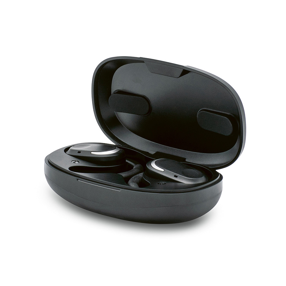 Aerotunes made from rABS with unique open ear design. Thought for running, workouts and cycling the 120-degree angle rotation ear clips stay secure. They deliver up to 30 hours of playtime have a built-in microphone for taking calls on the go and feature built-in base enhancement. Packed inside an individual kraft box.