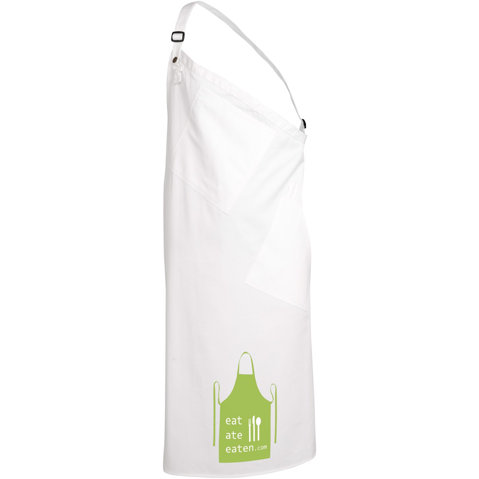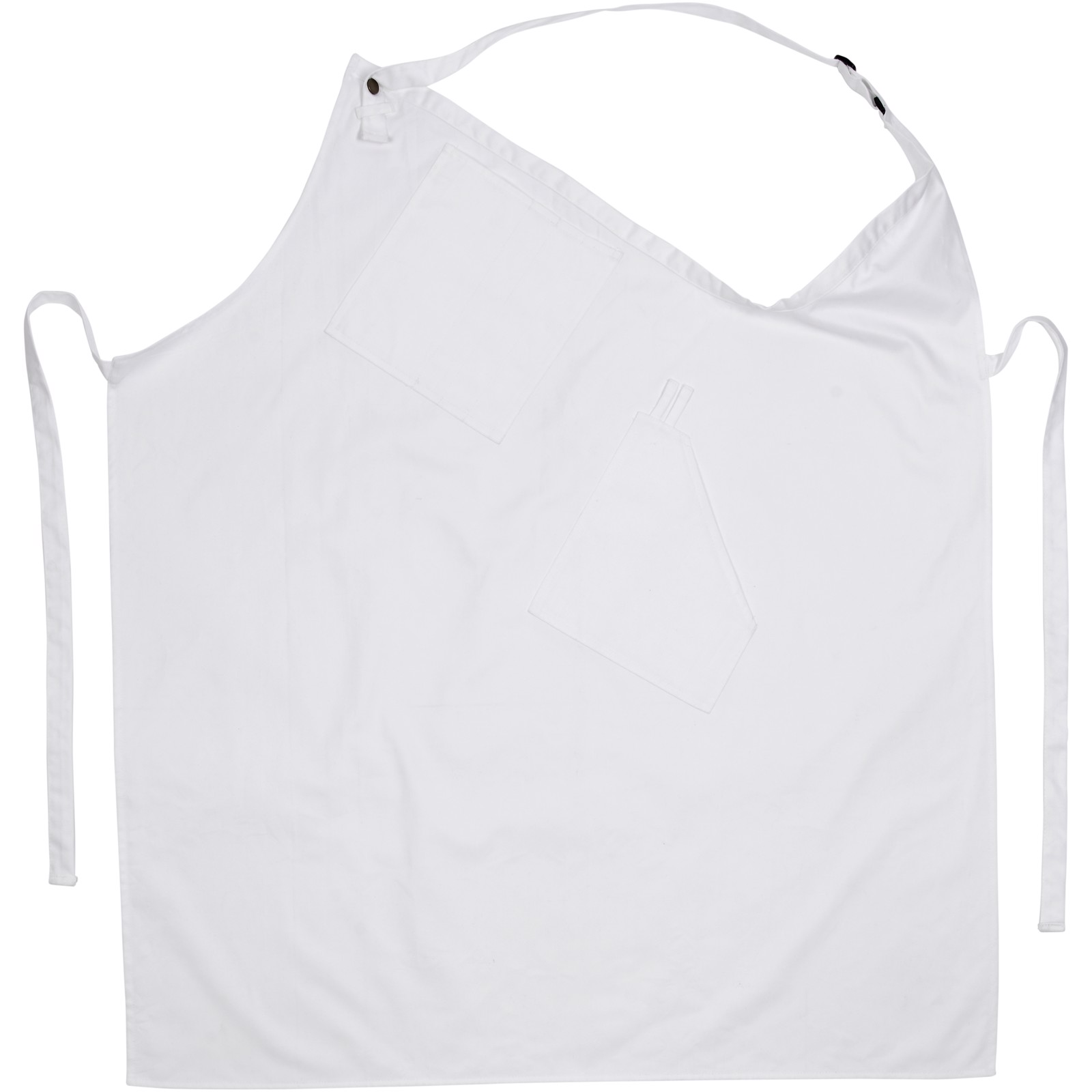 Twill fabric asymmetric apron with adjustable strap, 2 pockets, a towel loop and tie back closure. Made from 65% polyester and 35% cotton fabric.
