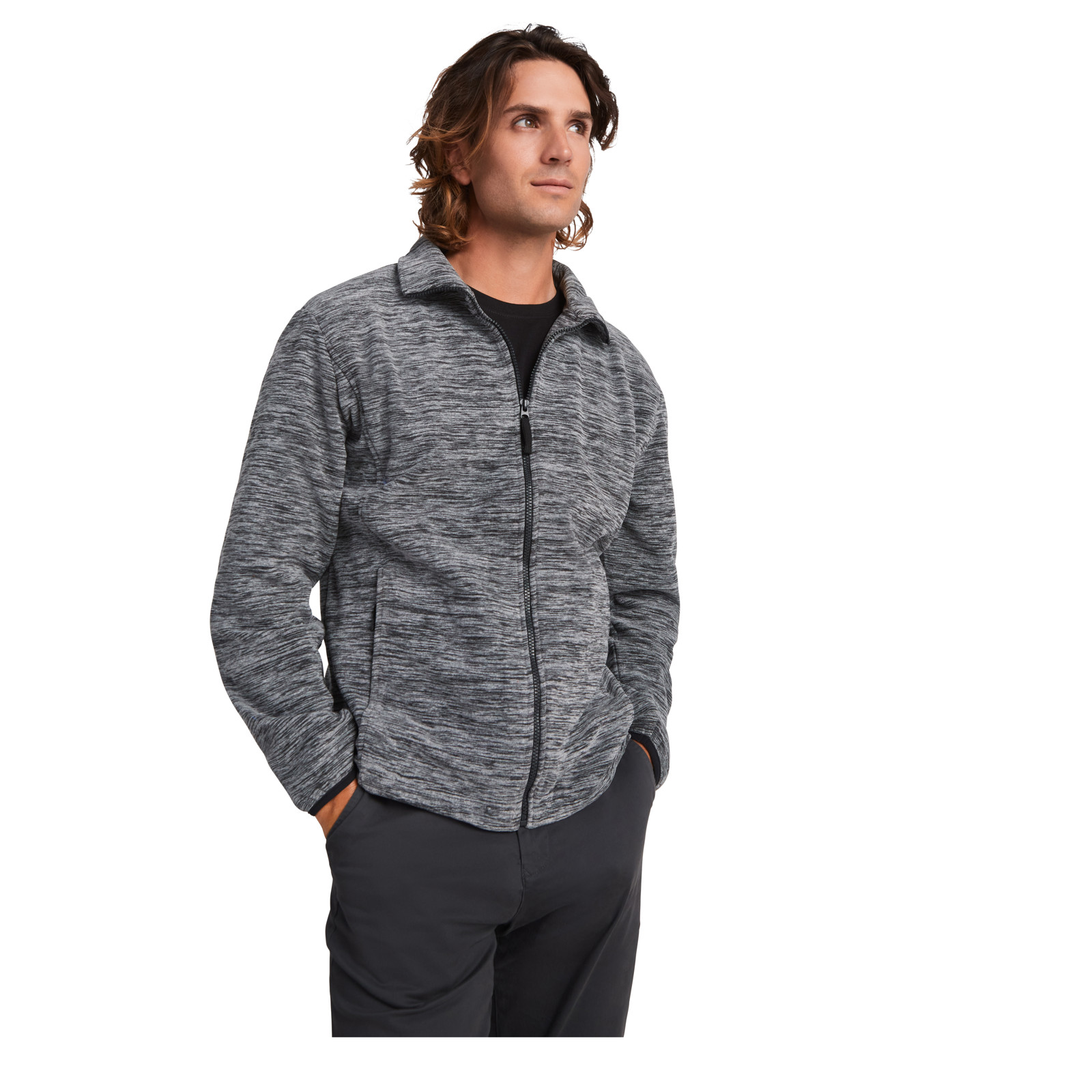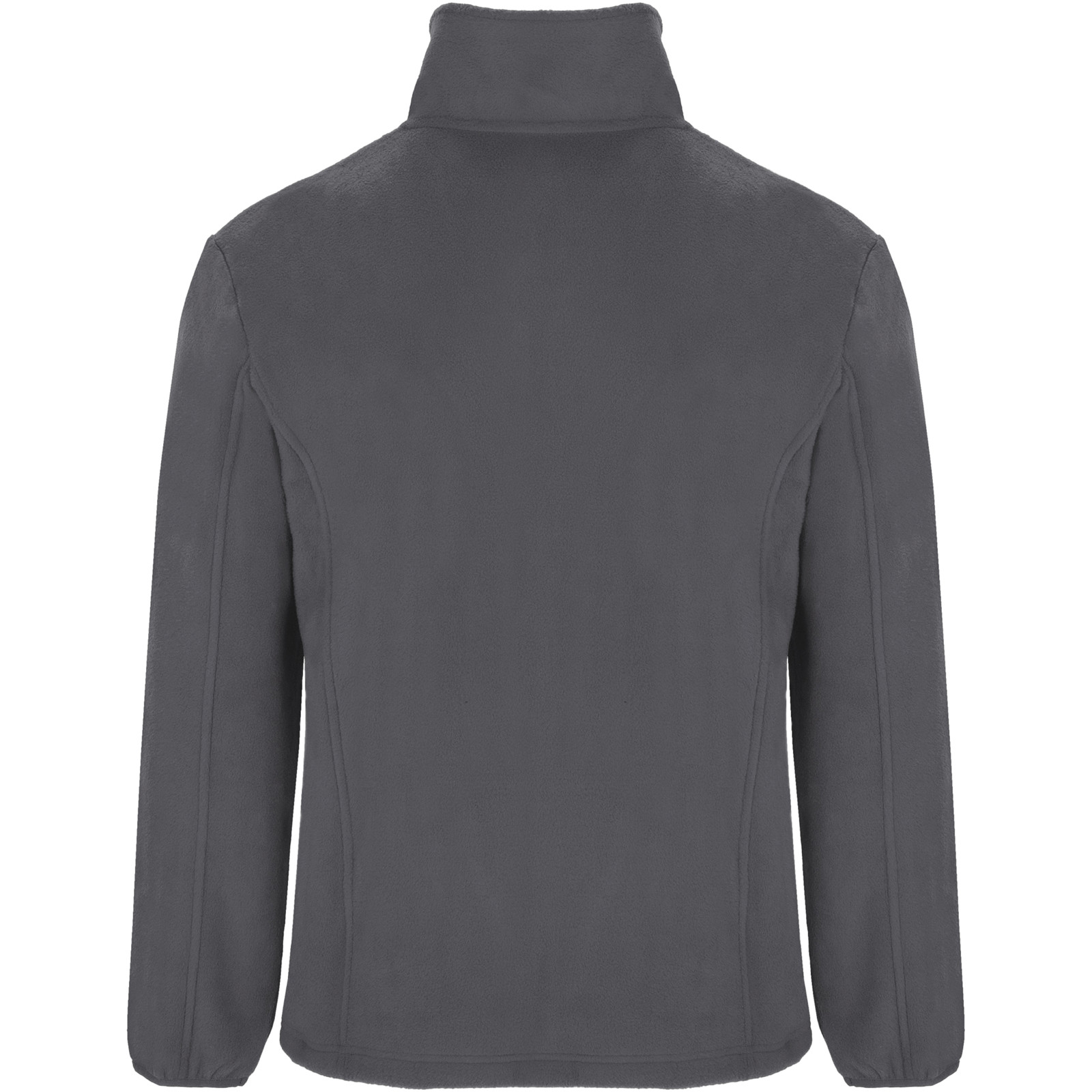 Fleece jacket with high lined collar and matching reinforced covered seams. Injected zip with matching puller made of fabric. Side pockets. Cuffs with elastic trim. Bottom hem with inner side adjusters. Removable label. The model is 185 cm and is wearing size M.