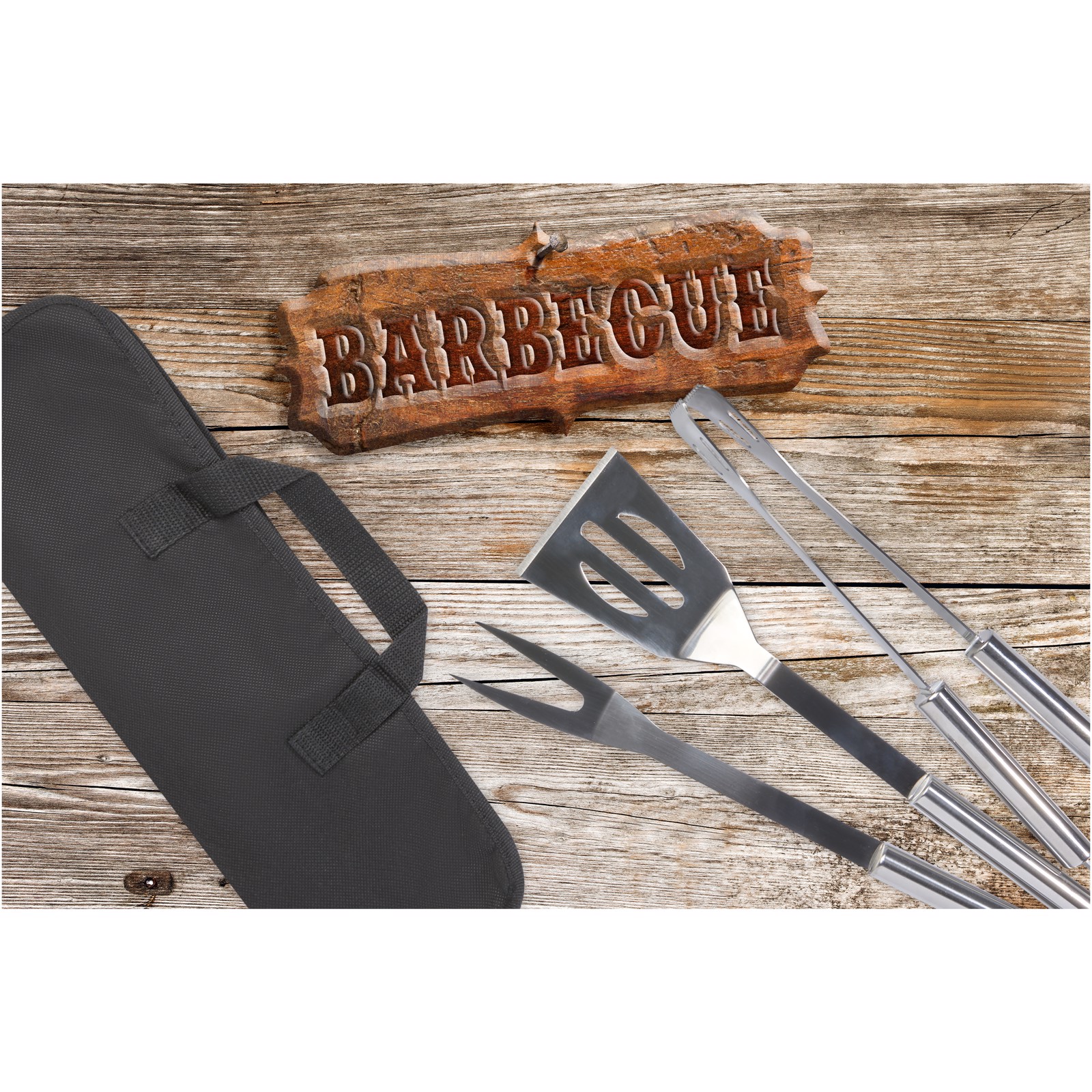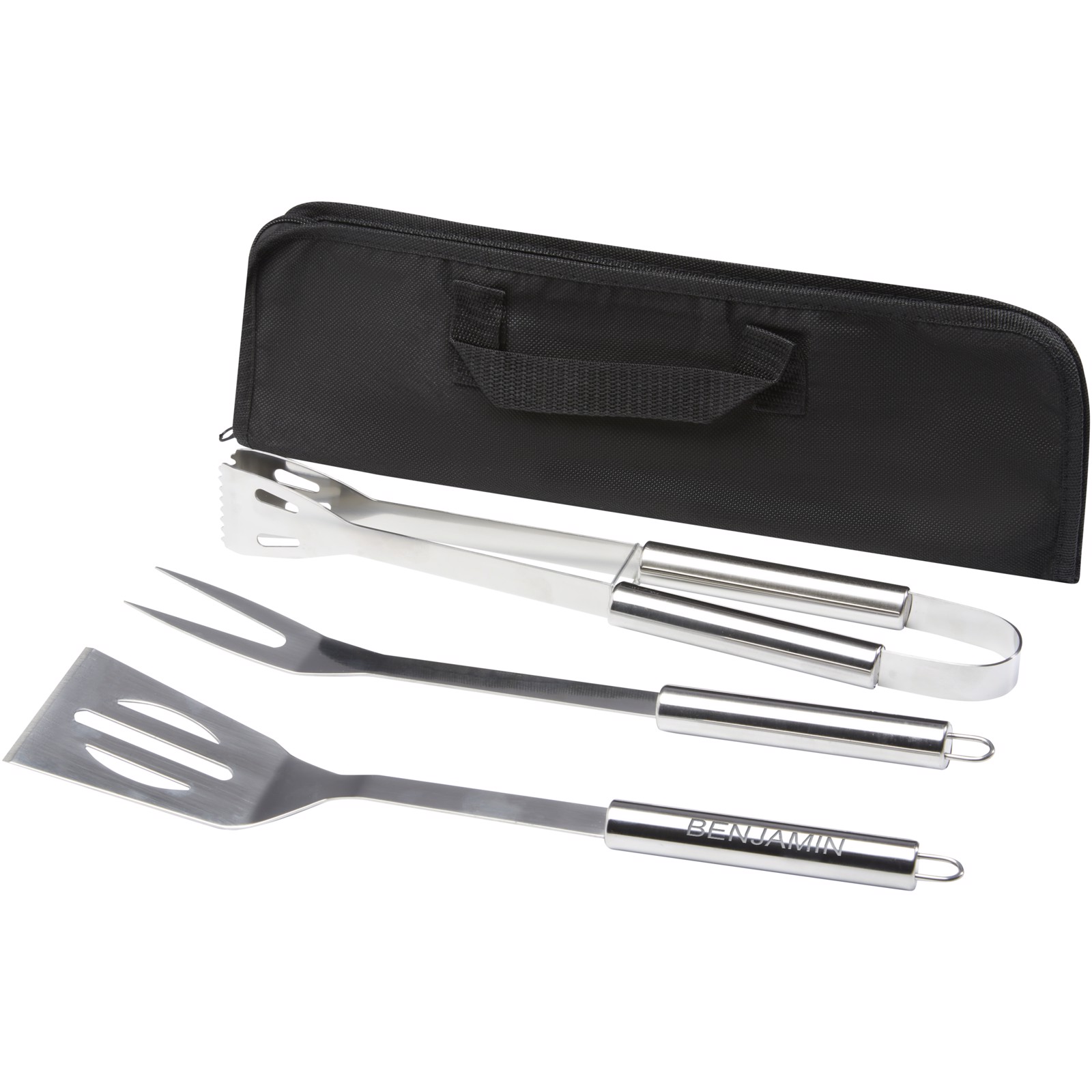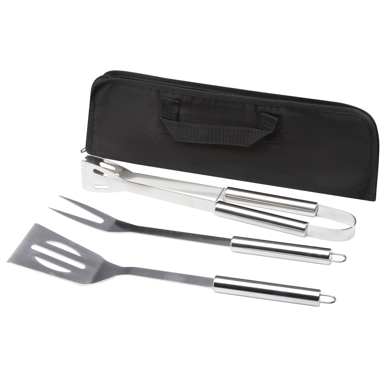 3-piece BBQ set with shovel (34.8 x 7.5 cm), fork (35.4 x 3.35 cm), and a tong (35 x 6.8 x 4 cm). All accessories are delivered in a lightweight case to make it easy to carry and store away. The perfect BBQ accessory for the garden or to bring along for some outdoor grilling with friends and family.
