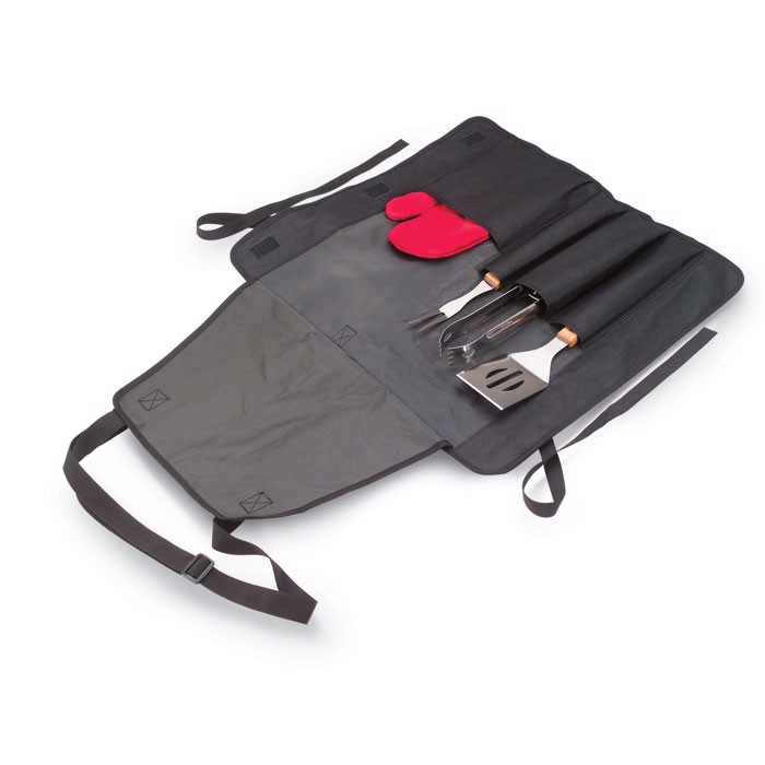 BBQ apron with three different BBQ tools and one glove. Apron in 600D polyester.