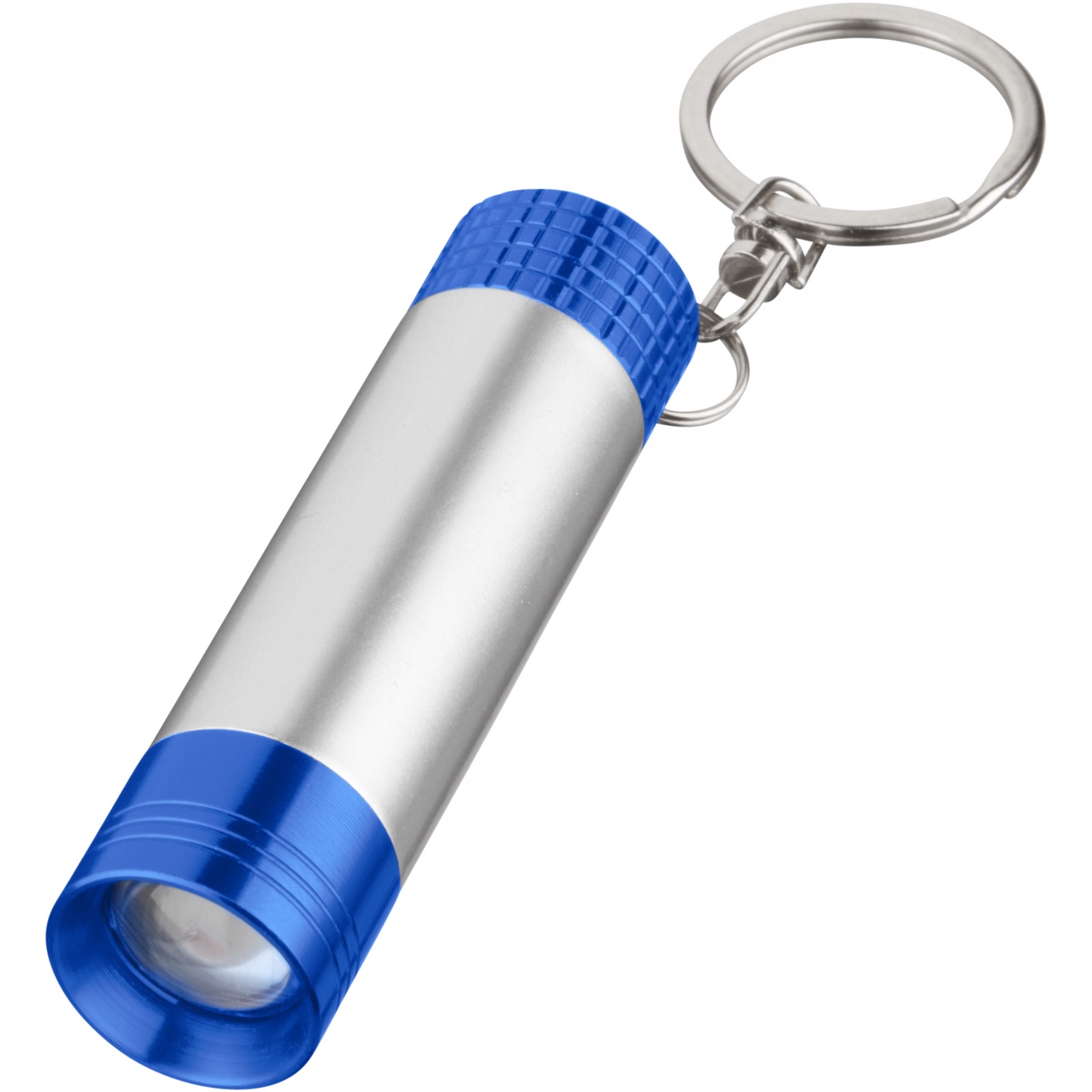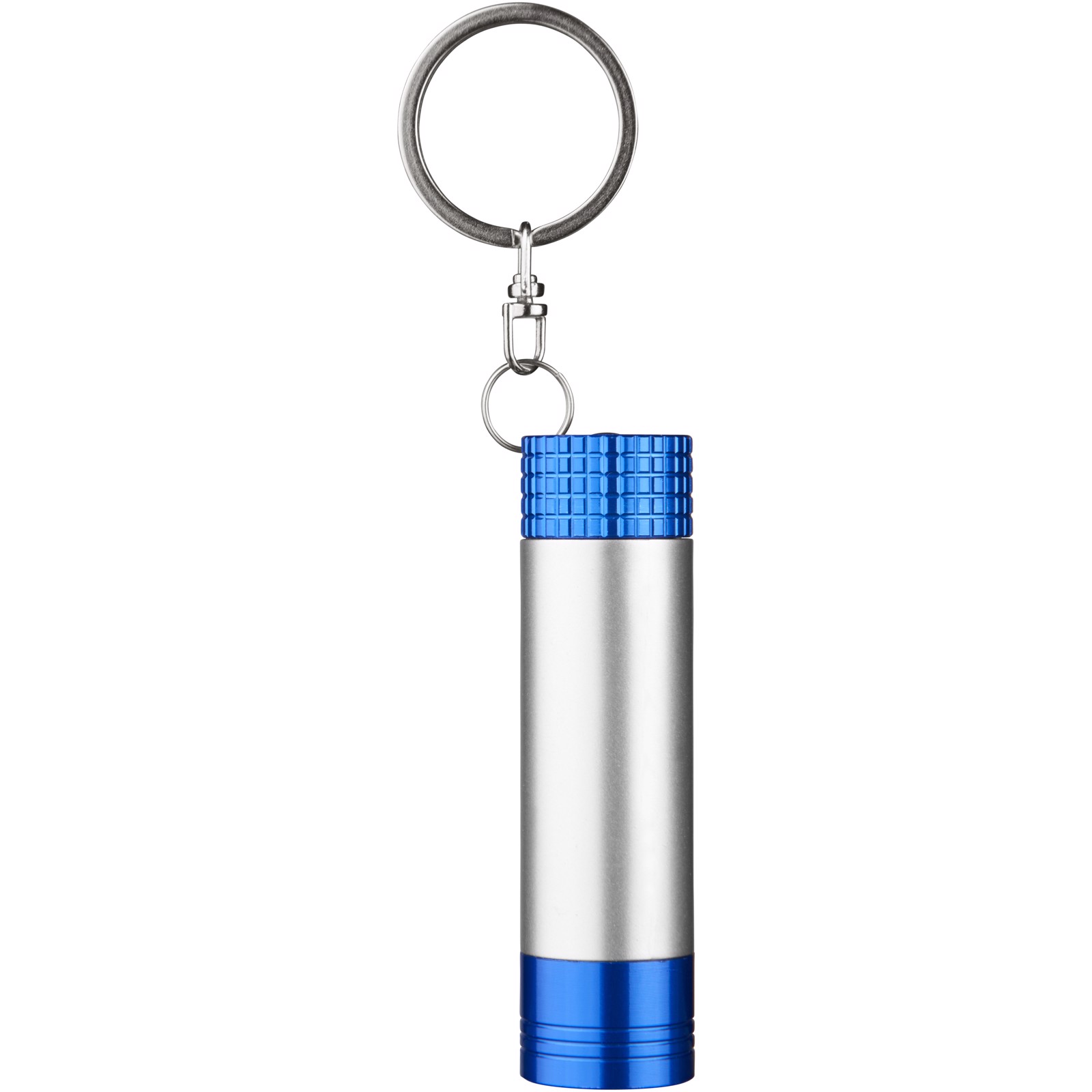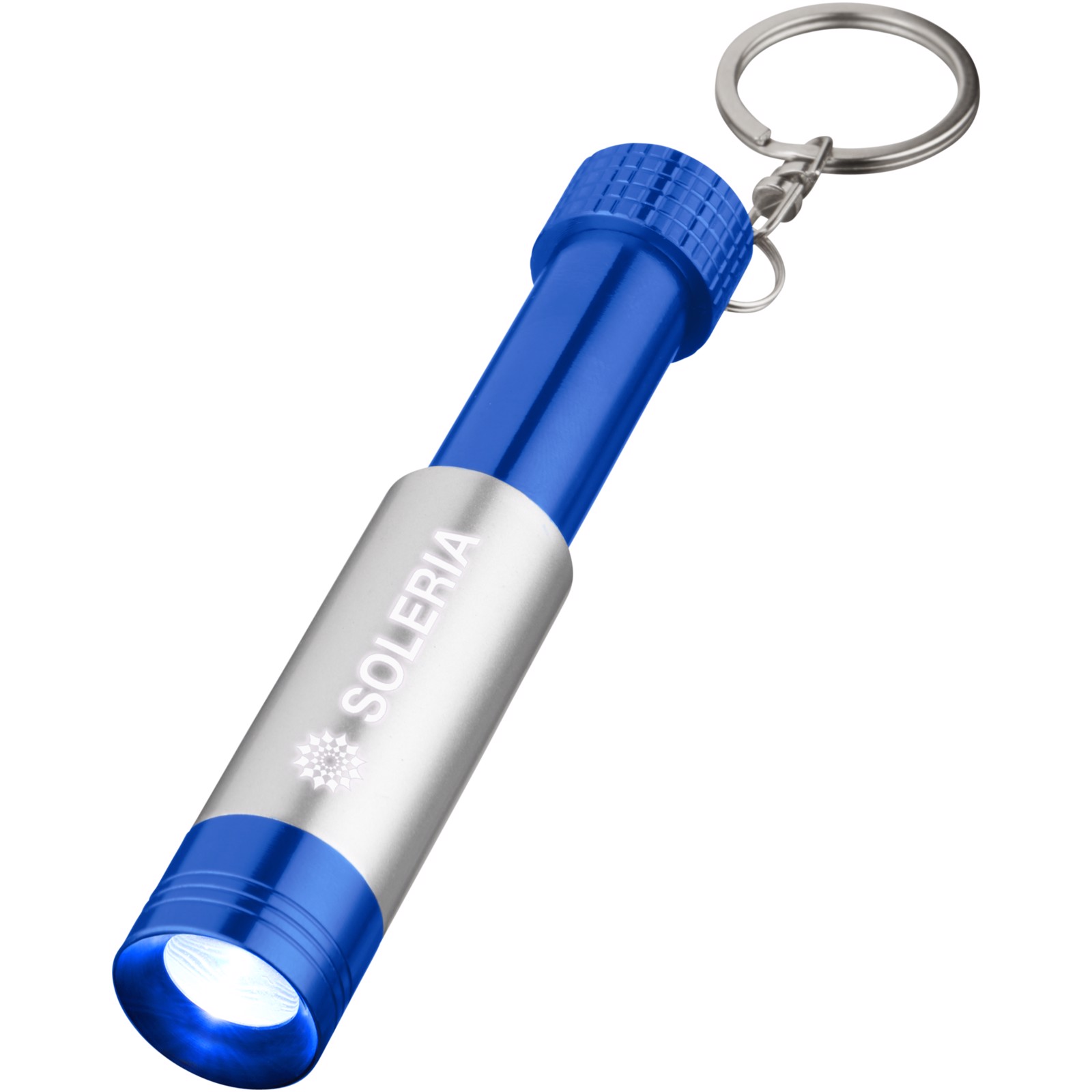 Single white LED light with push button power control at the back. Ideal to engrave, as your logo will pop up when pulling out the barrel. Metal split key ring. Batteries included.