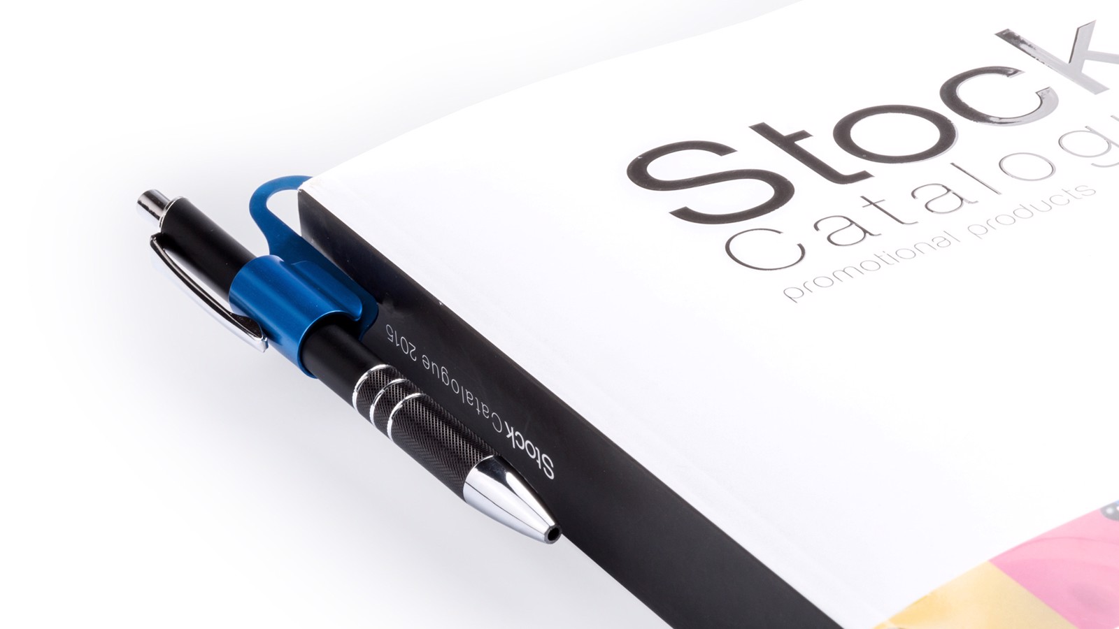 Original glossy aluminum bookmark in varied colors and with built-in pen holder. Presented in PVC case.