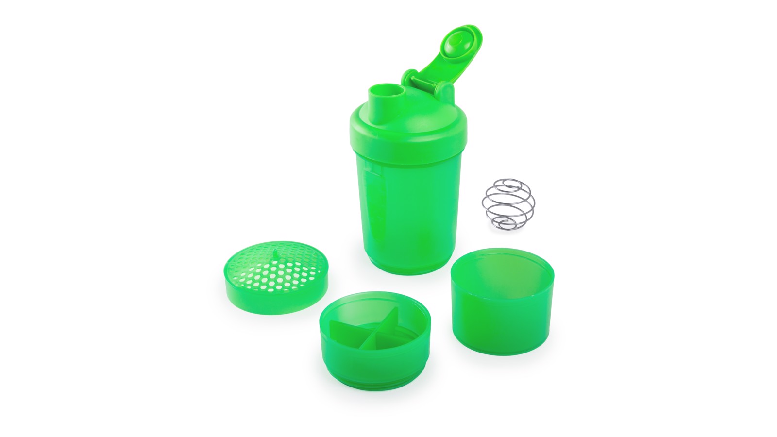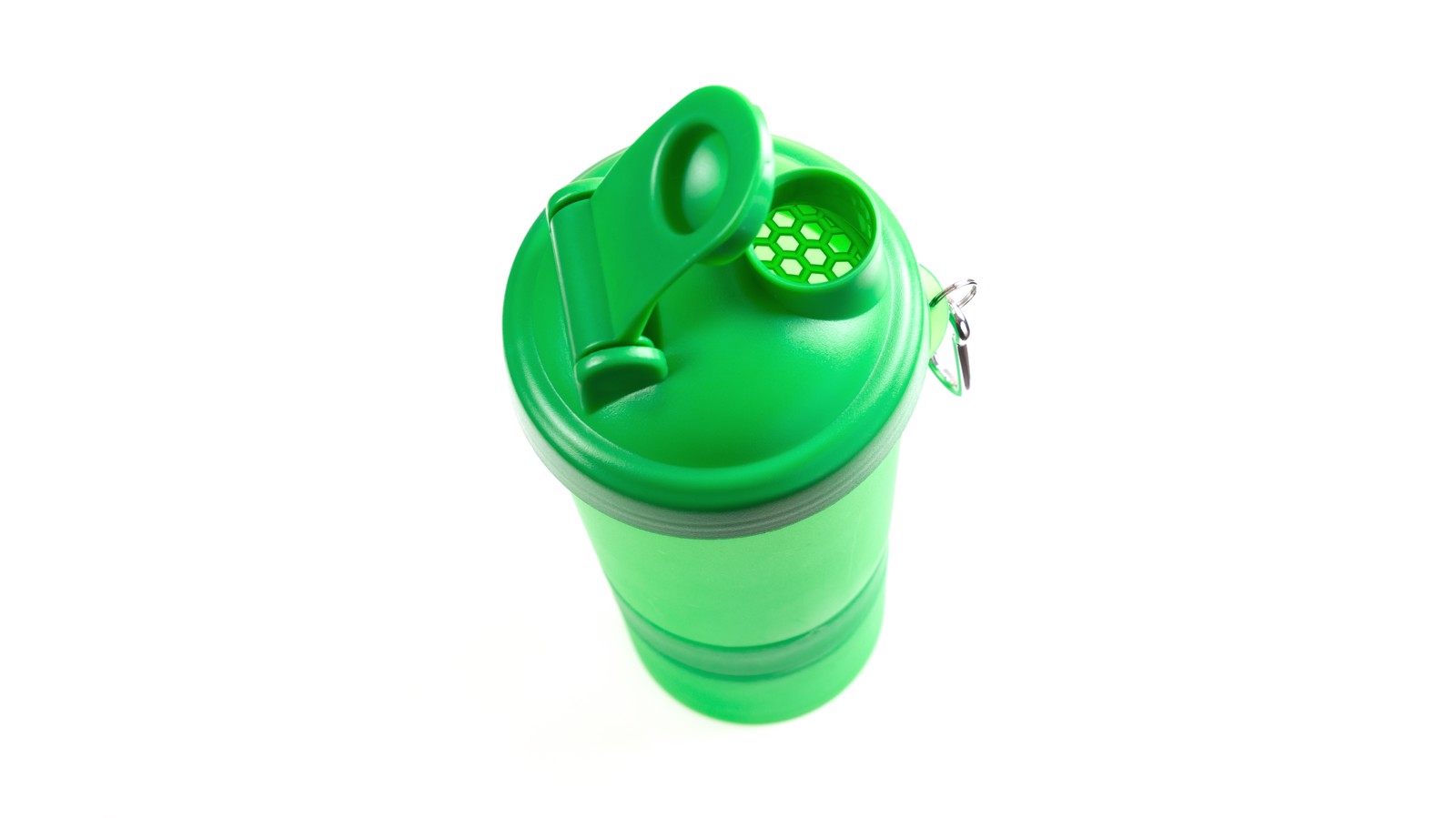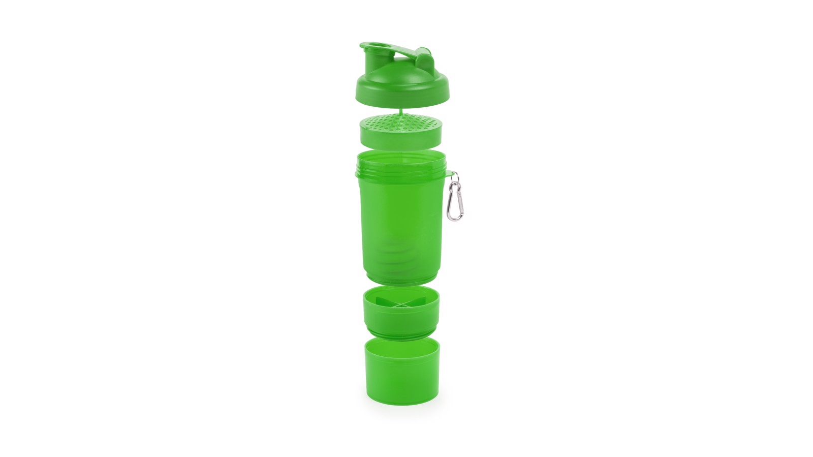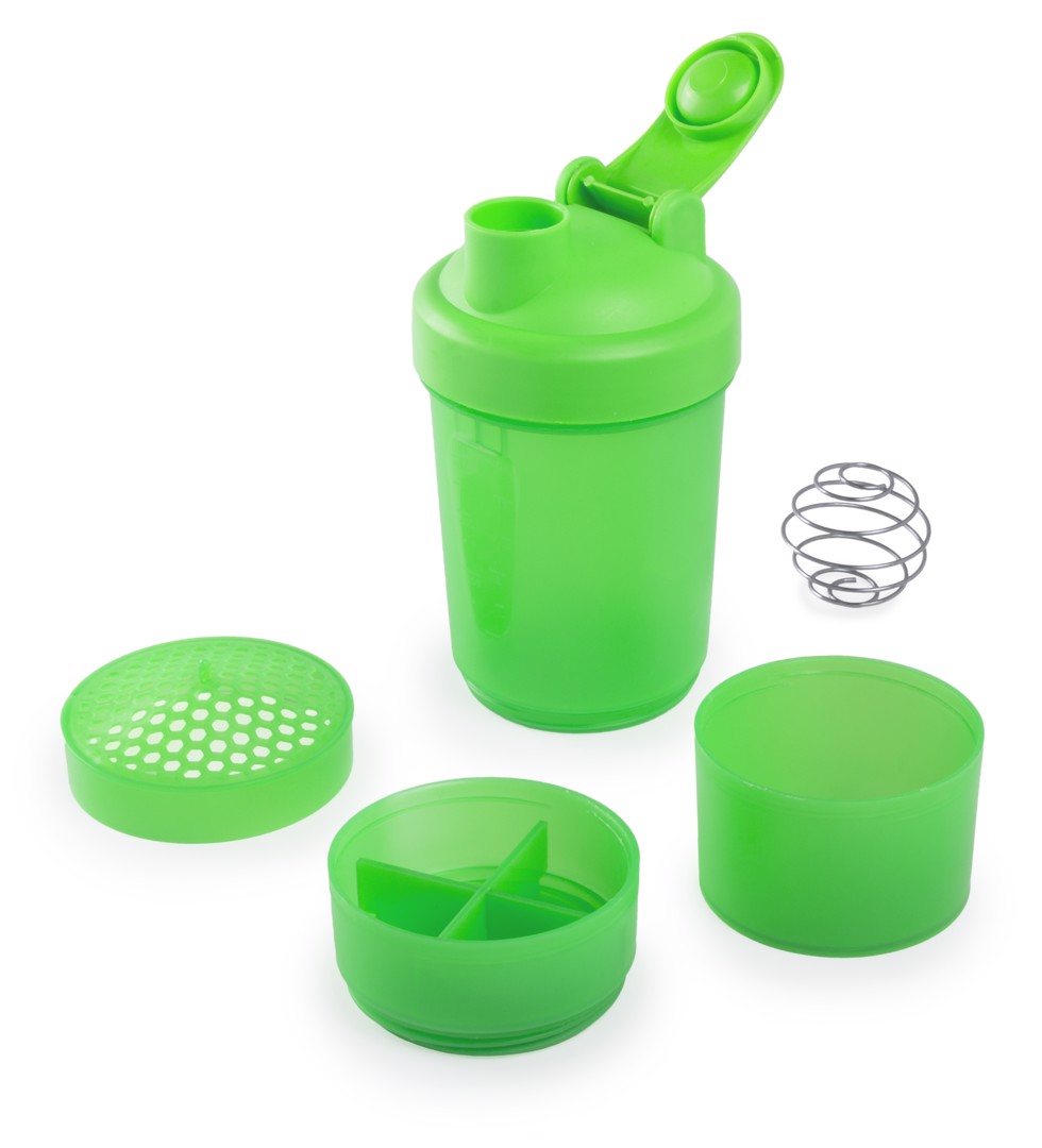 400ml capacity multi compartment bottle with PP finished body in bright tones and with an ingenious design. With screw-on cap and coverwith safety dosing device. Metal carrying carabiner. 400 ml