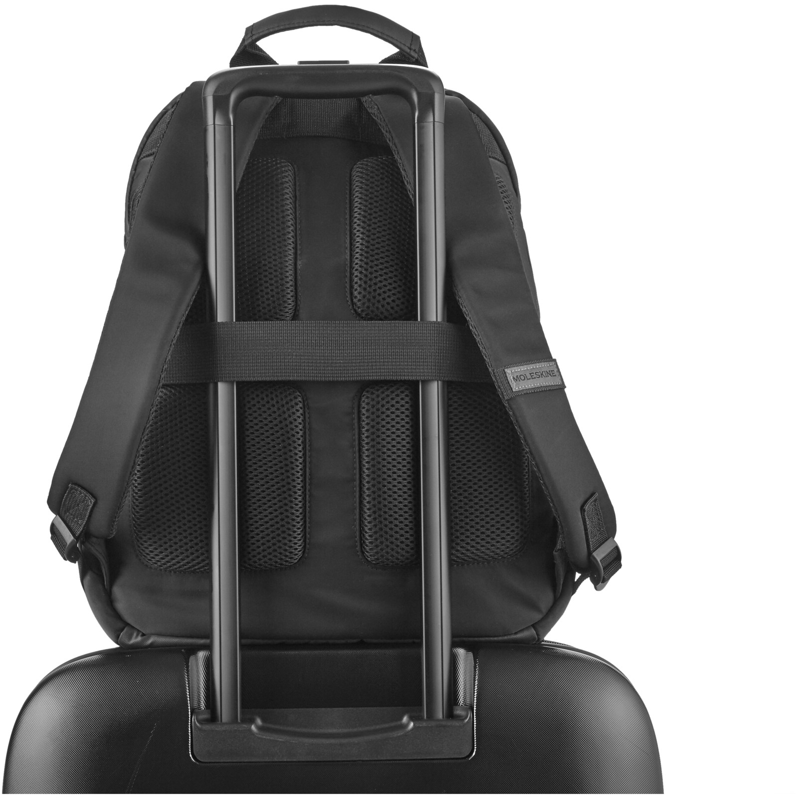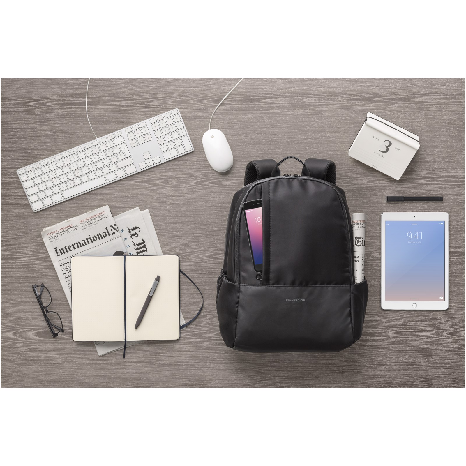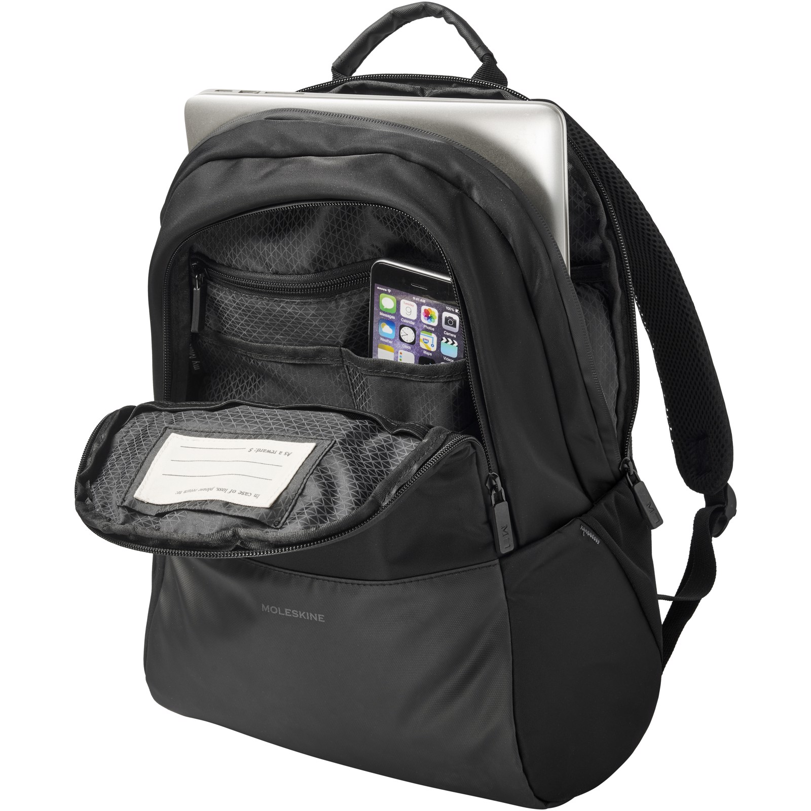 Business backpack with trolley strap, hidden security zipper, easy access outer zip pockets for phone and two sidepockets. Key features on the inside are padded laptop compartment (up to 15 inches), padded tablet (up to 10 inches), pockets for cards, tickets and receipts.