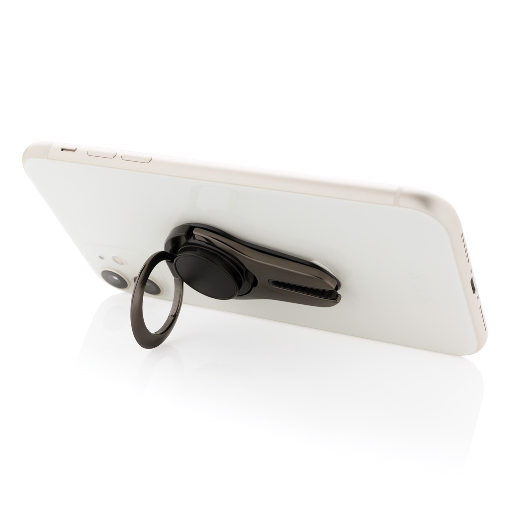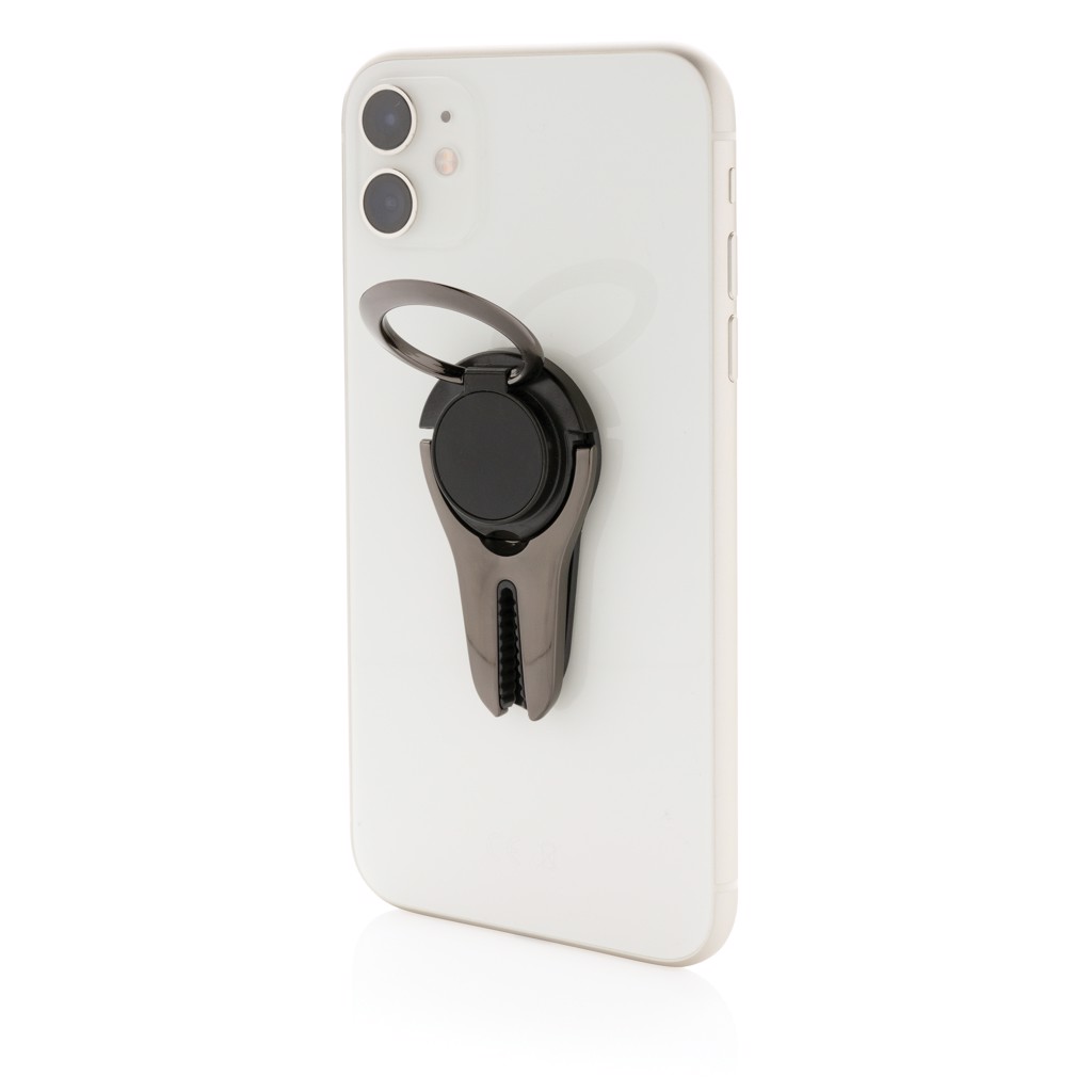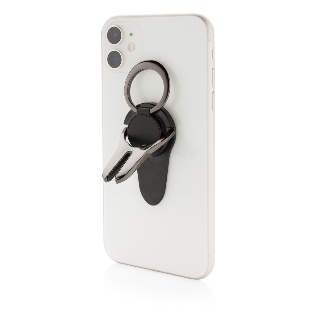 Phone holder that can easily be attached on the back of your mobile device. Once attached the ring can be used to hold your phone to watch content or be used as a stand. The ring holder can also be attached to the air vent of your car for easy navigation of hands free calling. Including adhesive tape for glass cased mobile phones like Iphone 8-X to ensure adhesion.