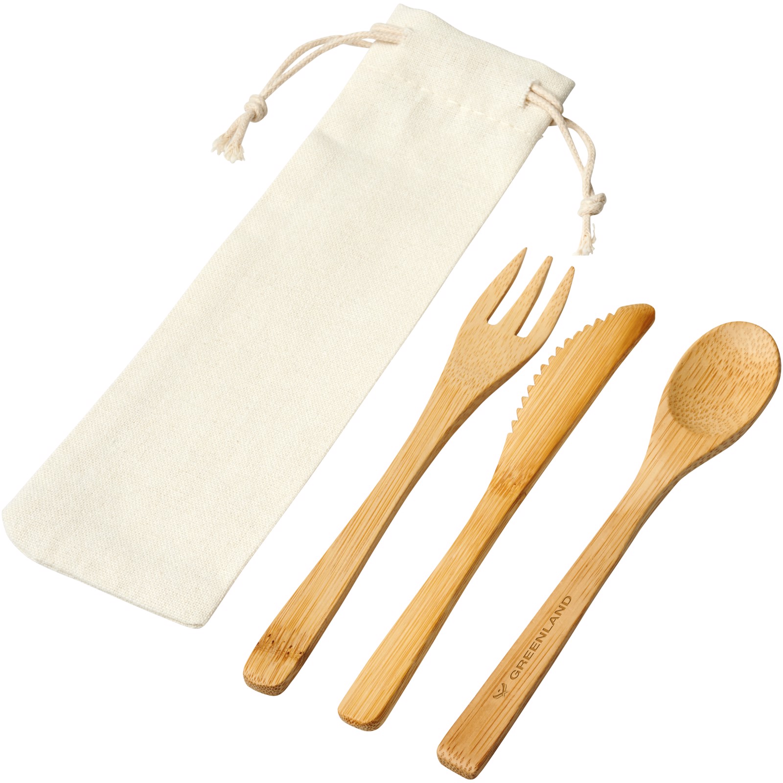 Cutlery set in bamboo comprised of a fork, knife, and spoon. Comes in a non-woven pouch.
