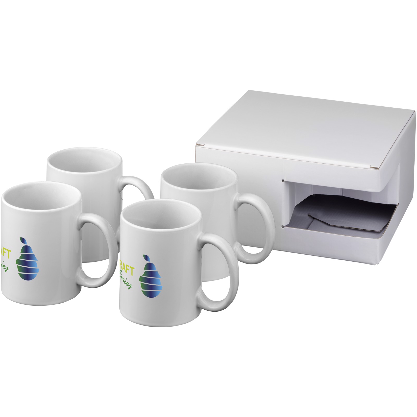 Gift set of four ceramic 330 ml mugs. Presented in a white gift box with see-through window.