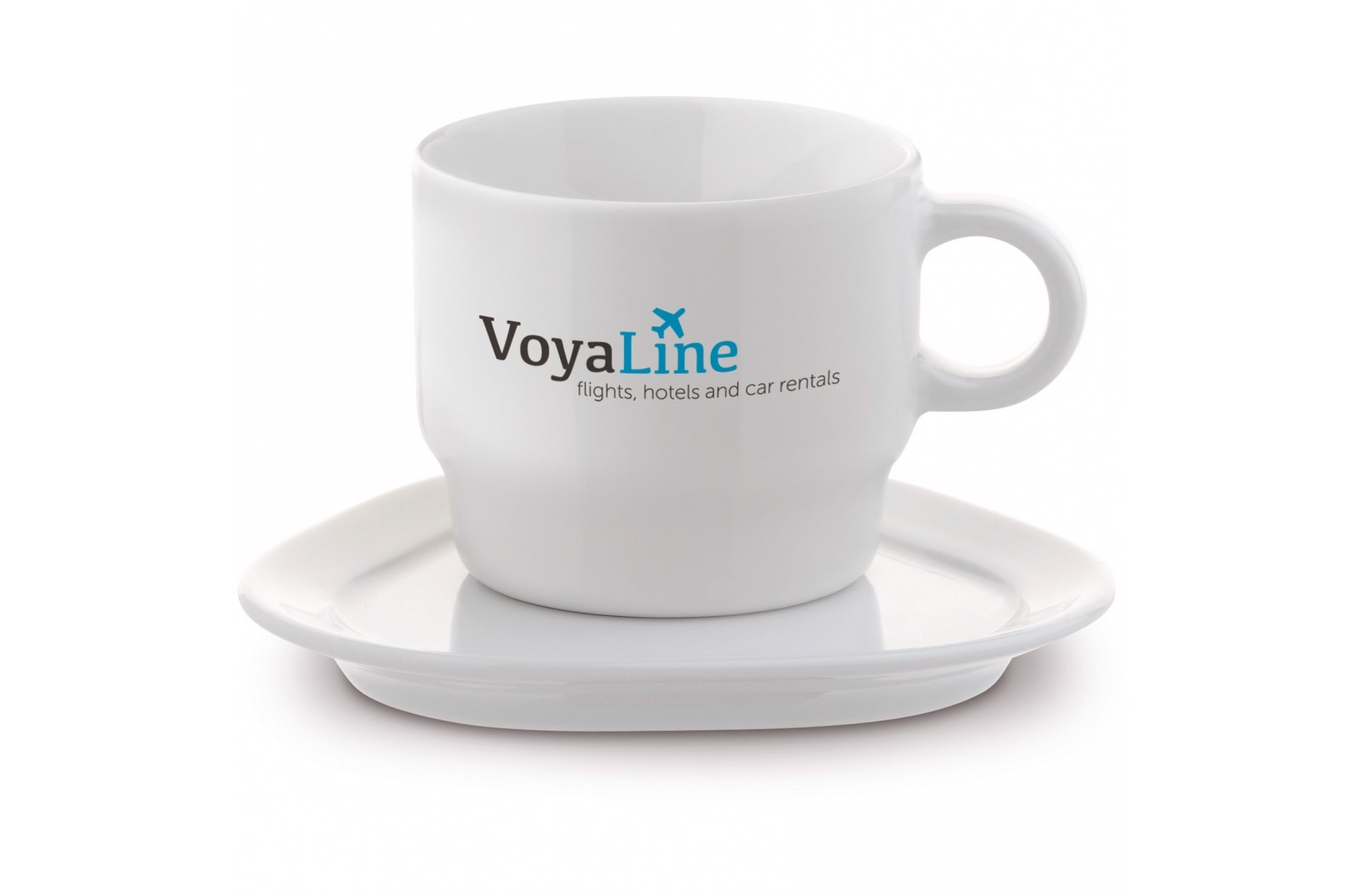 Cup and saucer of high quality porcelain from the Toppoint design 'Satellite' series. The cup has a big imprint space. The triangle shaped saucer has extra space around the cup. Produced in Europe.