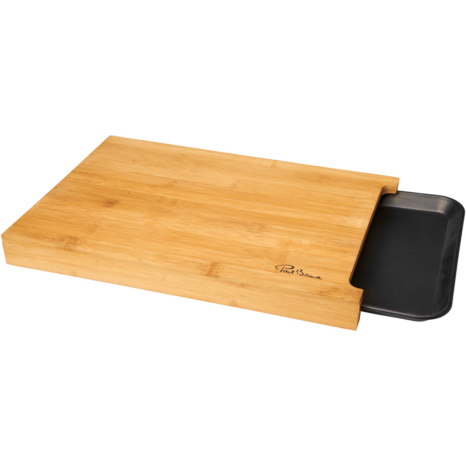 Versatile bamboo board with a handy tray that slides in place underneath the board.