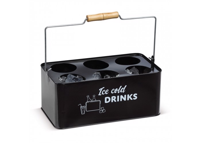 Cooling tray for siz bottles. The cooler can be filled with ice cubes to keep everything cold for a longer time. Easy to carry around due the handle.