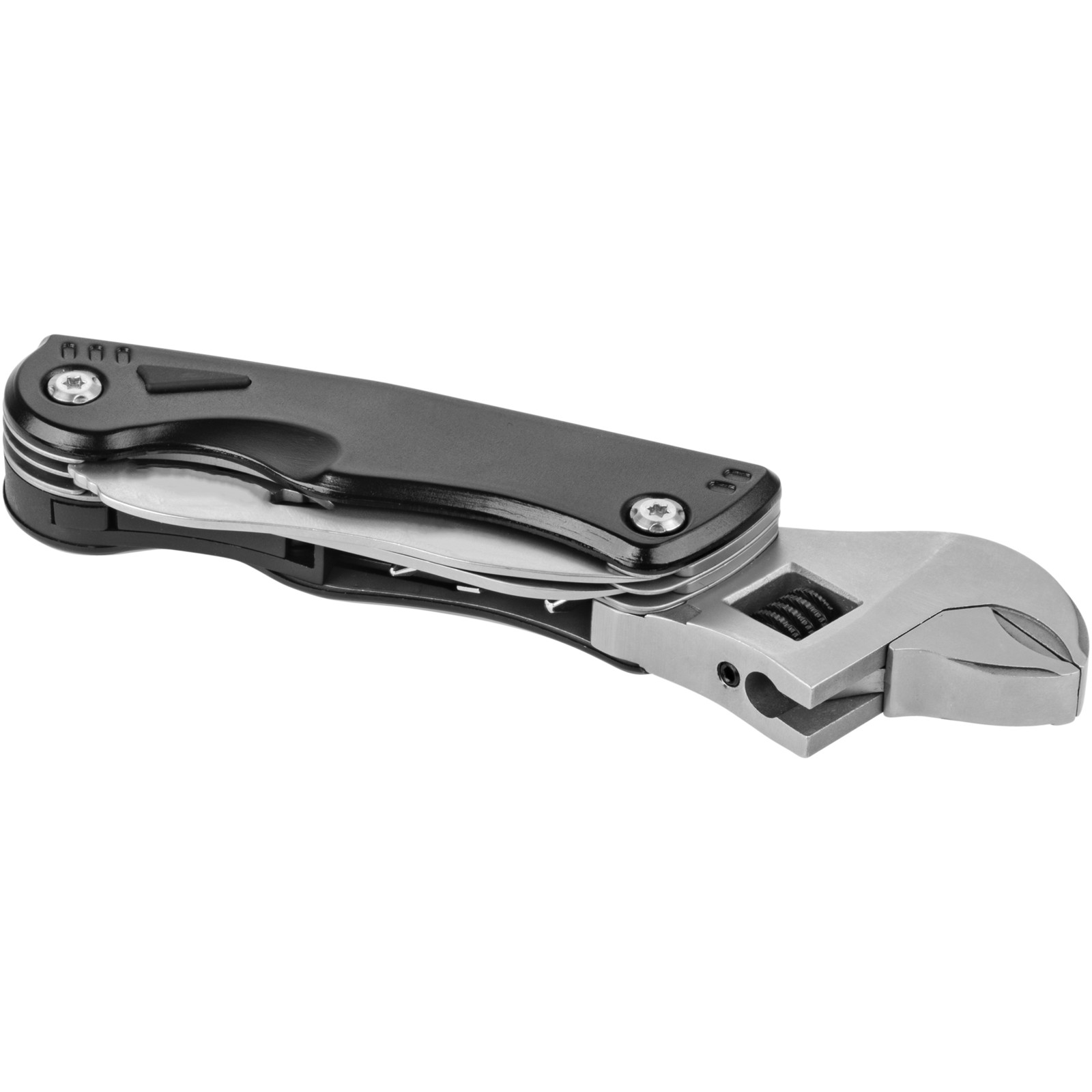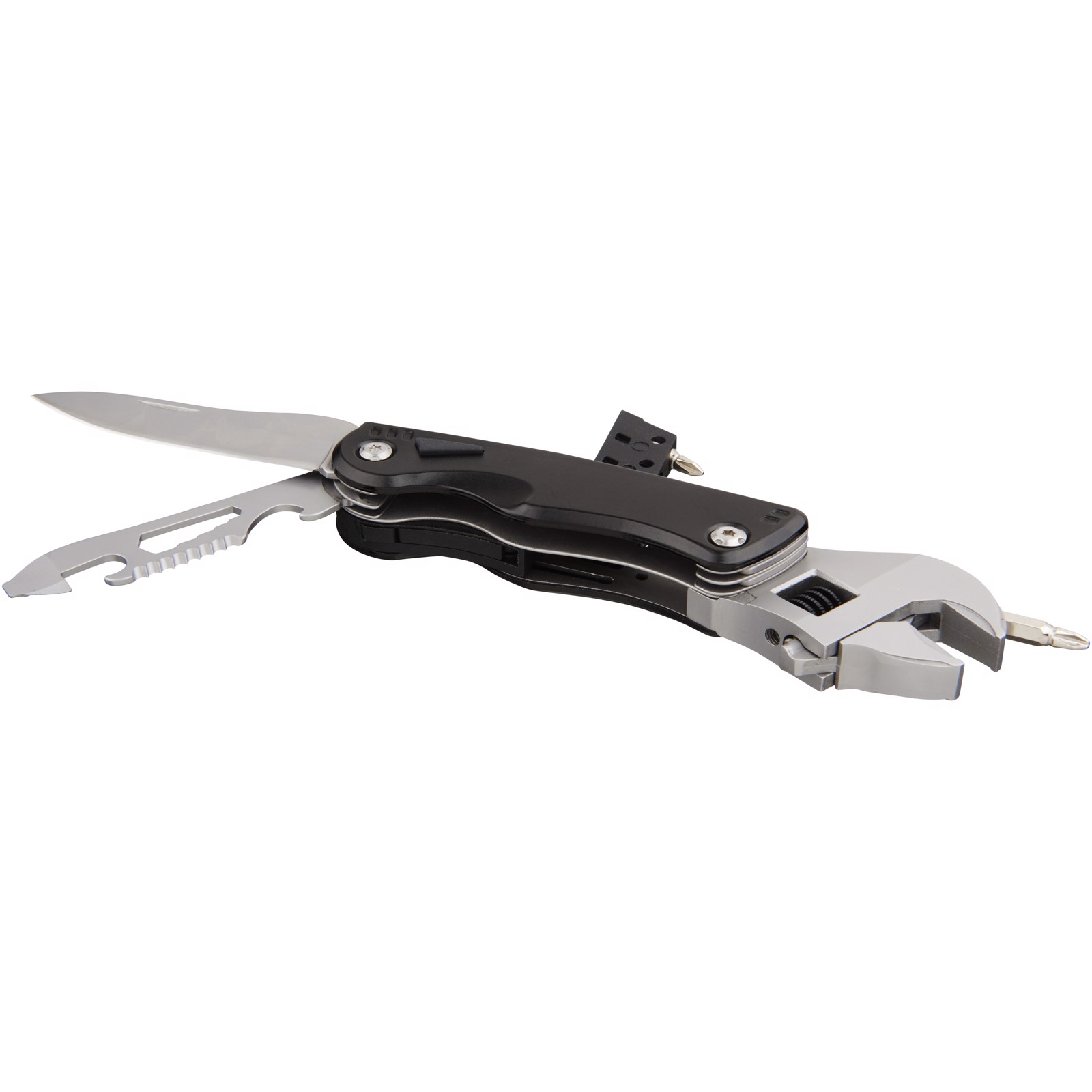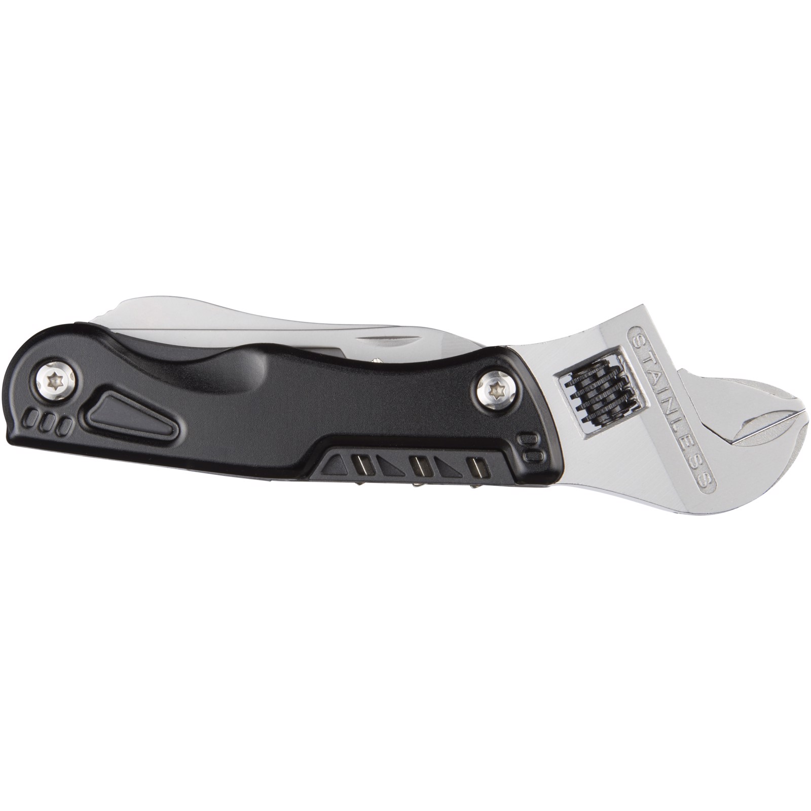Compact design multi-tool with adjustable wrench and LED light ideal for quick repairs. Also features a screwdriver slot incl. 3 screwdriver bits, a knife, saw, can and bottle opener. Packed in a STAC gift box..