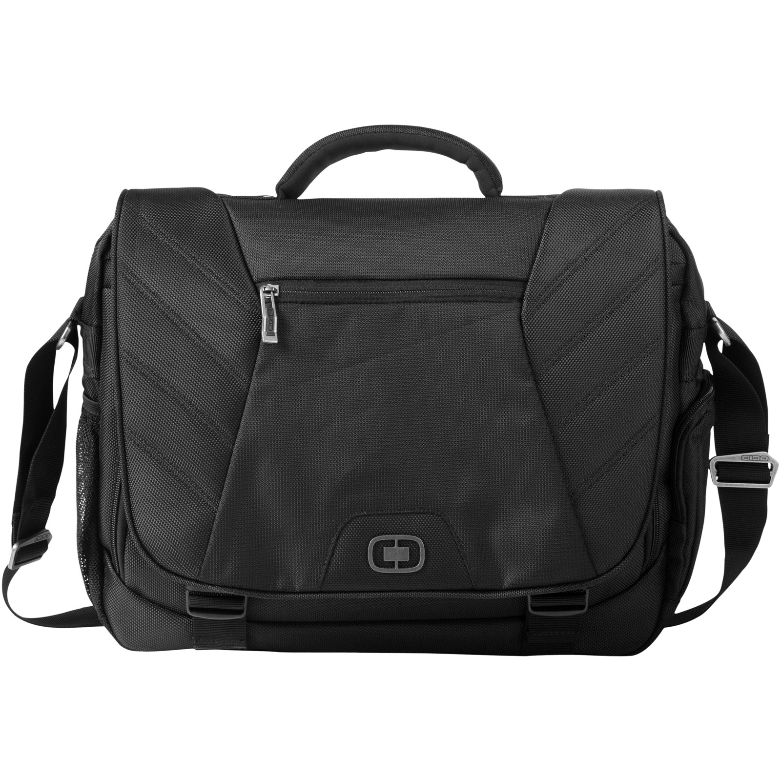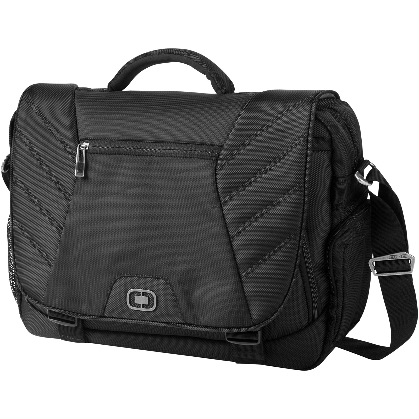 Elgin 17" laptop conference bag. Exclusive design bag with flapover construction with double lock closure. Interior padded laptop compartment and padded tablet/e-reader sleeve. Easy access zippered pockets for business essentials. Side beverage/accessory pocket. Attachment strap to fit over most luggage trolley handles. Removable adjustable padded shoulder strap and reinforced top handle. 1680D Polyester.