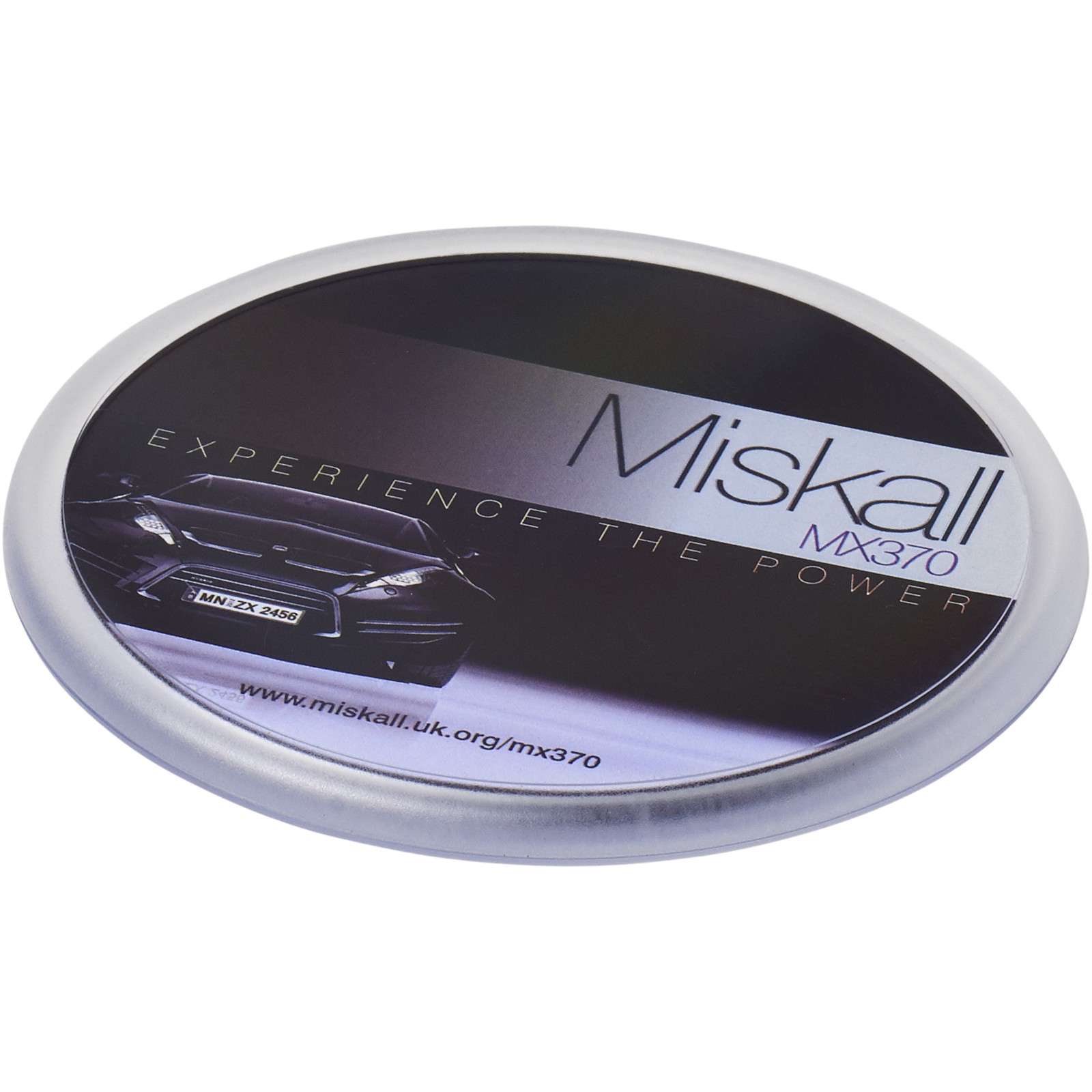 Two-part plastic coaster that carries a printed paper insert. Paper insert can be printed on both sides.