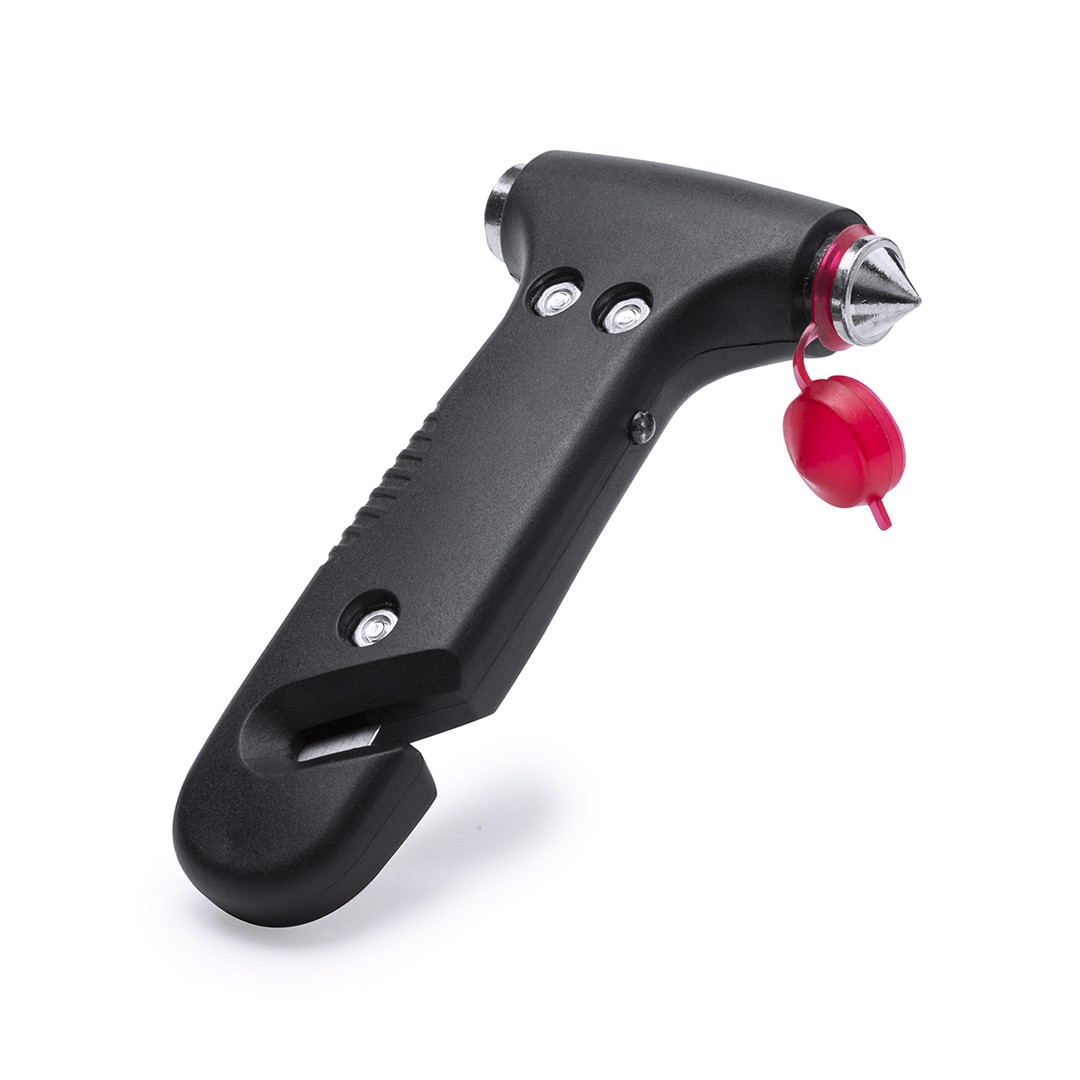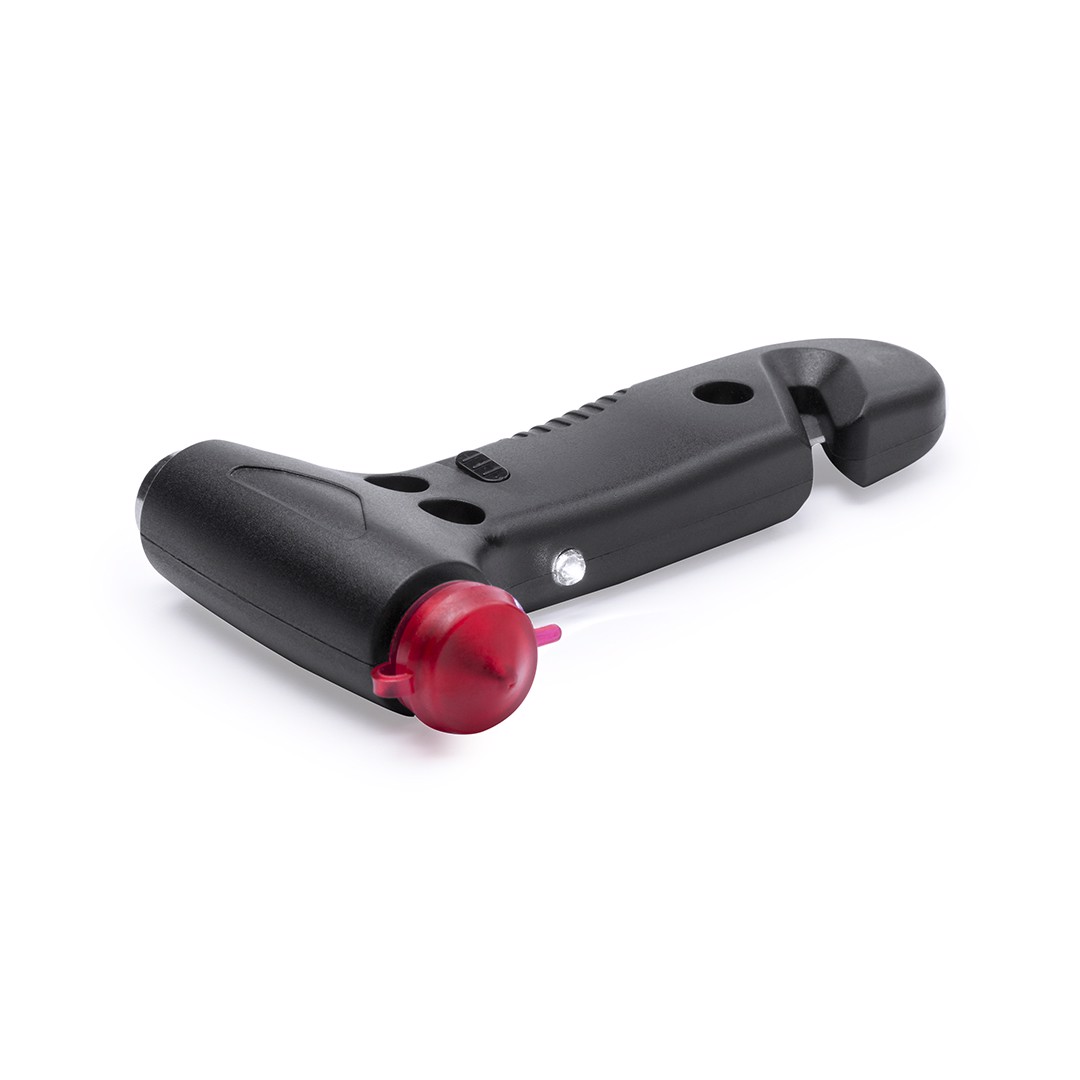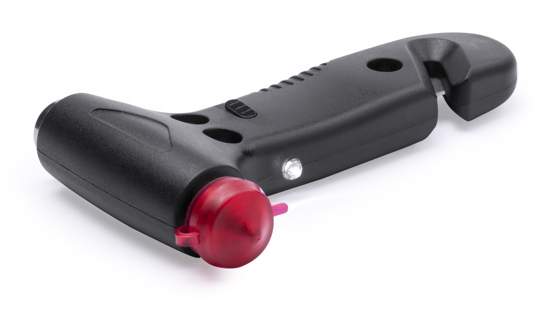 Multifunction LED emergency hammer. With white LED flashlight, glass breaker hammer and belt cutter blade. Presented in an attractive design box. 1 Led. 3 Functions. Button Batteries Included