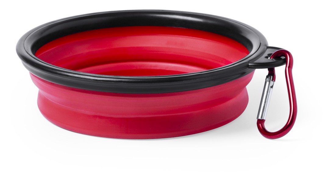 Folding bowl for pets in resistant TPR material. Designed for solids and liquids, with 450ml capacity and matching color metal carabiner. Available en a wide range of colors.