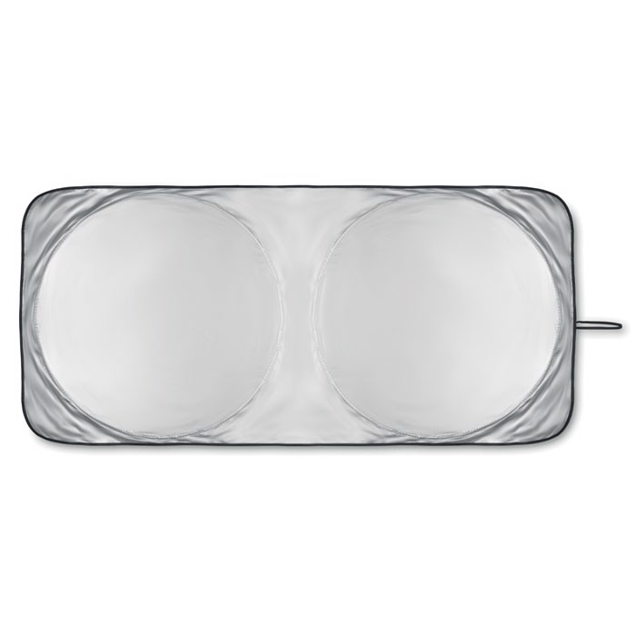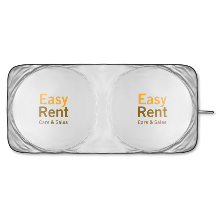 Foldable sun car visor in 170T polyester including pouch.