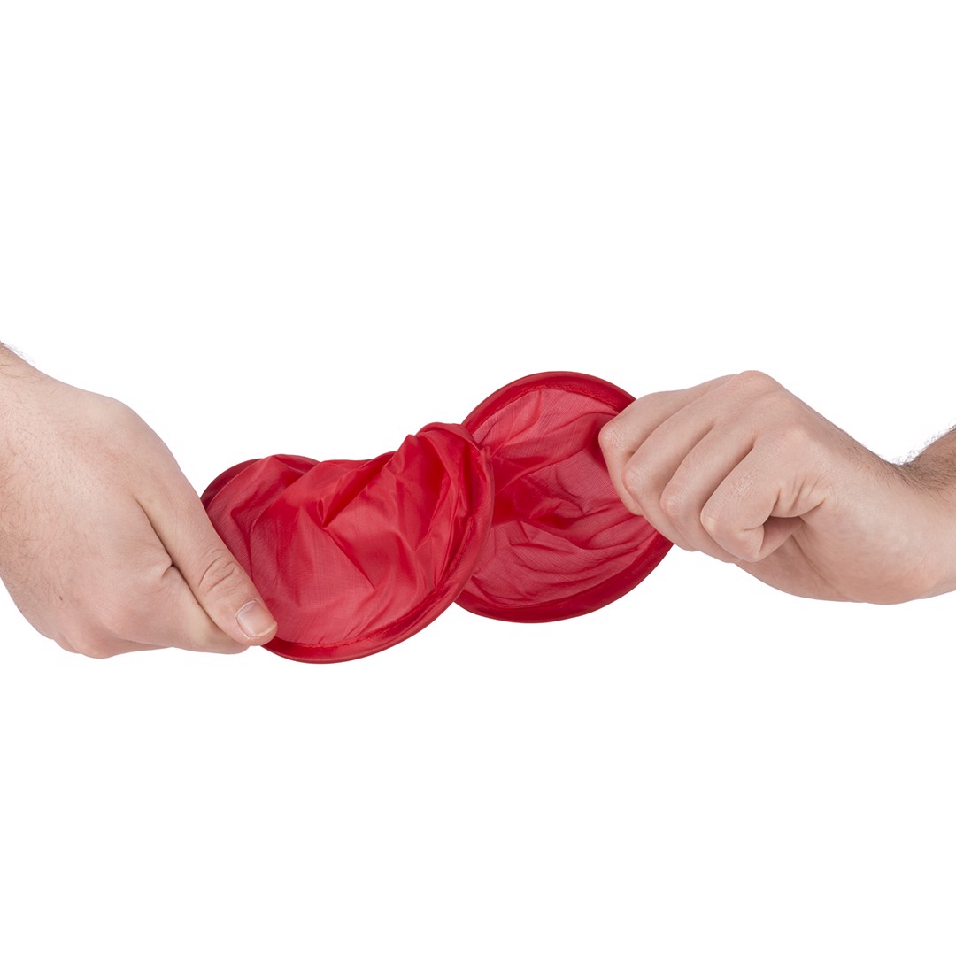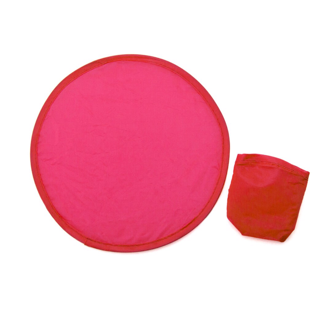 Foldable polyester Frisbie in bright tones, with matching color individual pouch. Easy folding system for a compact size. Foldable