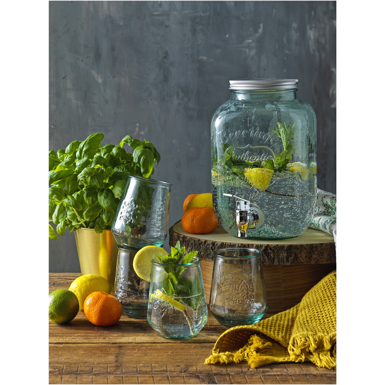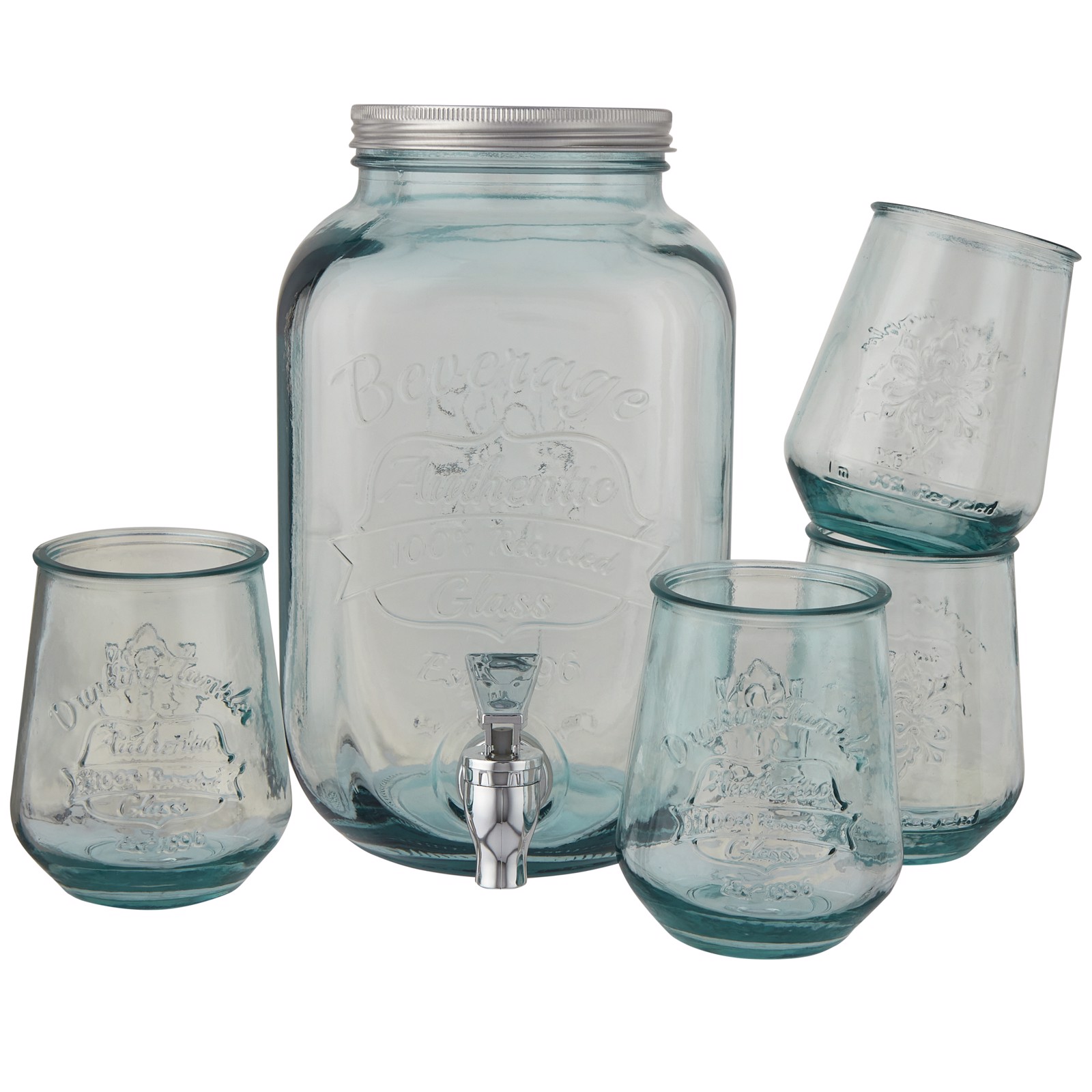 5-piece 100% recycled glass beverage drink set featuring 4 glasses (400 ml) and 1 dispenser (4L) with stainless steel lid. With this beverage dispenser set you can serve sangria, fresh juice, and ice tea on a grand scale with all features you’ll need to keep the party flowing. The fully assembled stainless steel tap provides an easy long-lasting pour every time. Every piece is made of recycled glass bottles. Recycled glass is manufactured using less energy, raw material, and additives, than what is required for making traditional glass. Dishwasher safe.