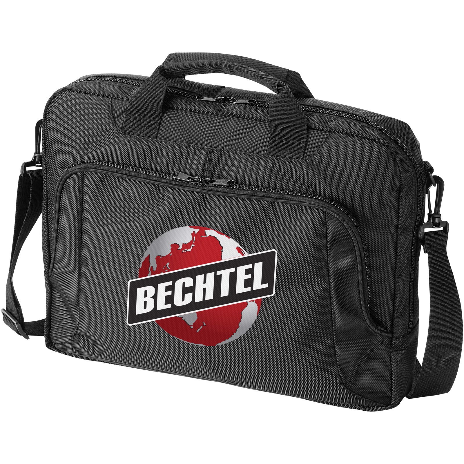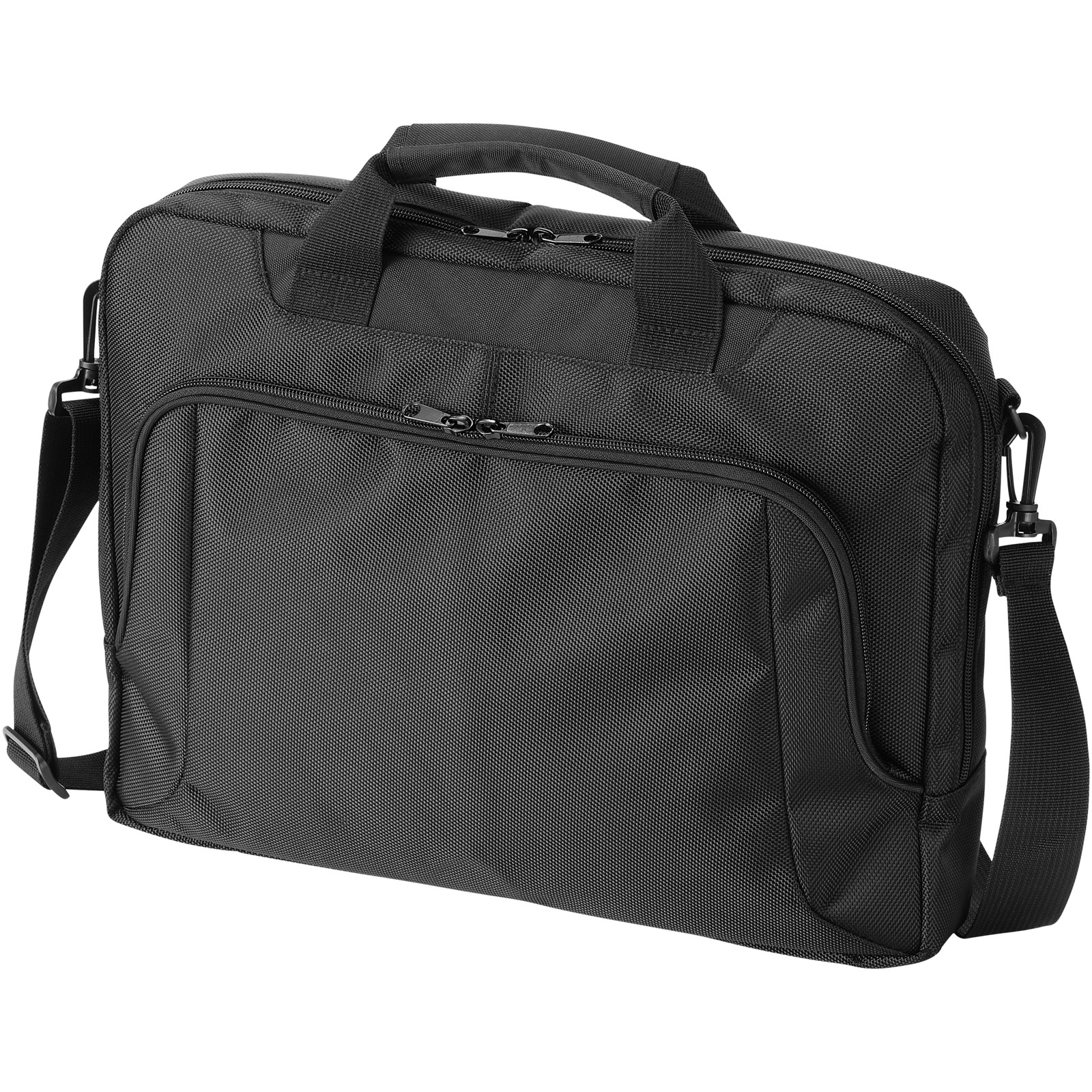 Double handled laptop bag with laptop compartment inside main compartment and 10" tablet sleeve. Fully featured organiser in front zipper pocket. With trolley strap on the back and adjustable removable padded shoulder strap.