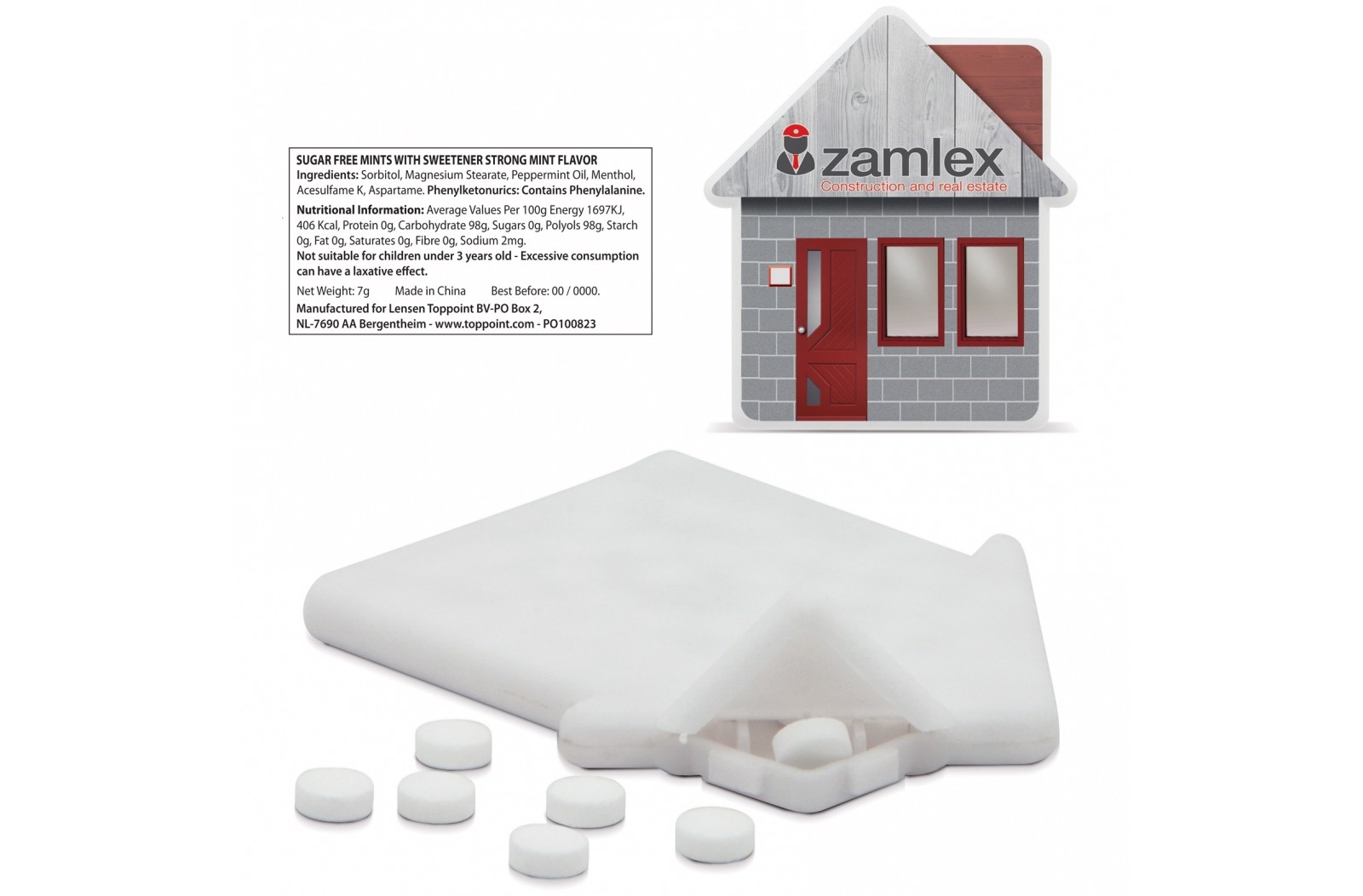 Cute white peppermint box in the shape of a house. Opening of the box in the chimney. Circa seven grams of sugerfree peppermints. Available for full-colour digital print or pad print. Product safety directive one every tin.