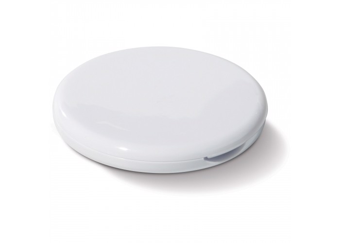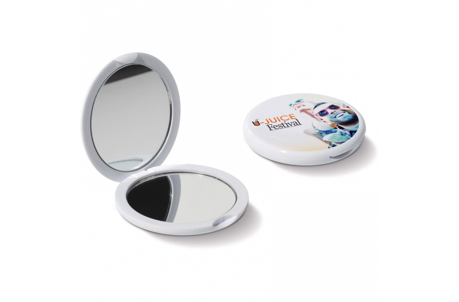 A flat mirror with two mirrors on the inside. one normal and one magnifying mirror. Easy to take with you. Digital imprint possible, big imprint space.