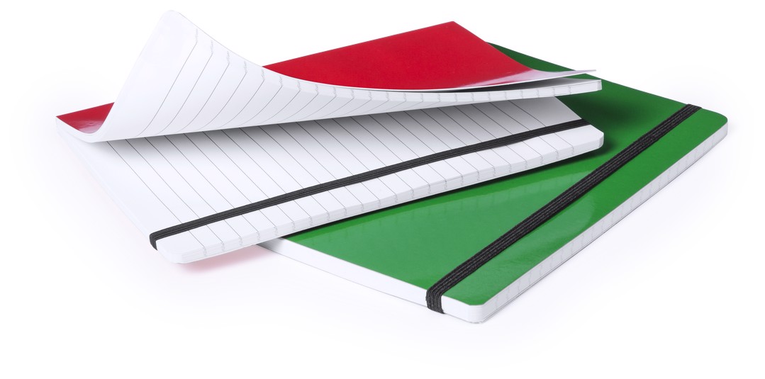 Notebook with soft touch covers in bright cardboard in an original colors. 80 sheets striped layout, with elastic support and elegant black fabric bookmark. 80 Sheets