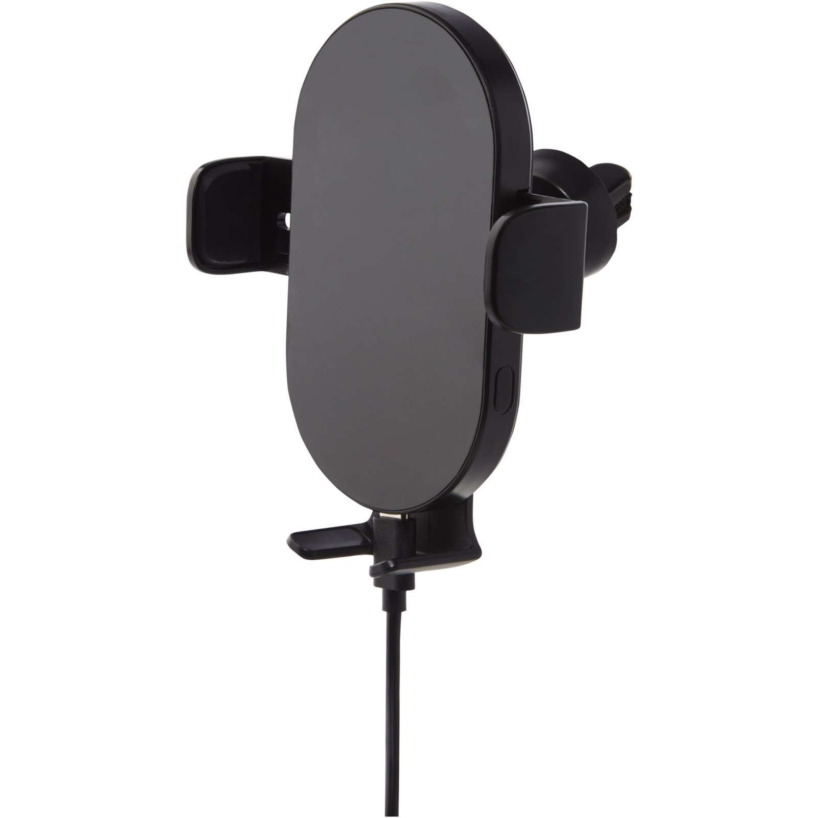 15W universal car phone holder and charger. With its FOD (Foreign Object Detection) sensor, this charger can easily be operated with one hand. Simple place the device on the charger and it will tighten automatically. Ideal for satellite navigation and for charging the phone while on the road. The phone can be placed in a vertical or horizontal position thanks to the 360° rotating clip. Compatible with all Qi devices (iPhone 8 or above and Android devices that supports wireless charging) and it also supports fast charging. Input 12V/1.67A. Wireless output: 15W (max). Comes with a 100 cm TPE Type-C cable and an instruction manual. Delivered in a premium kraft paper box with a colourful sticker.