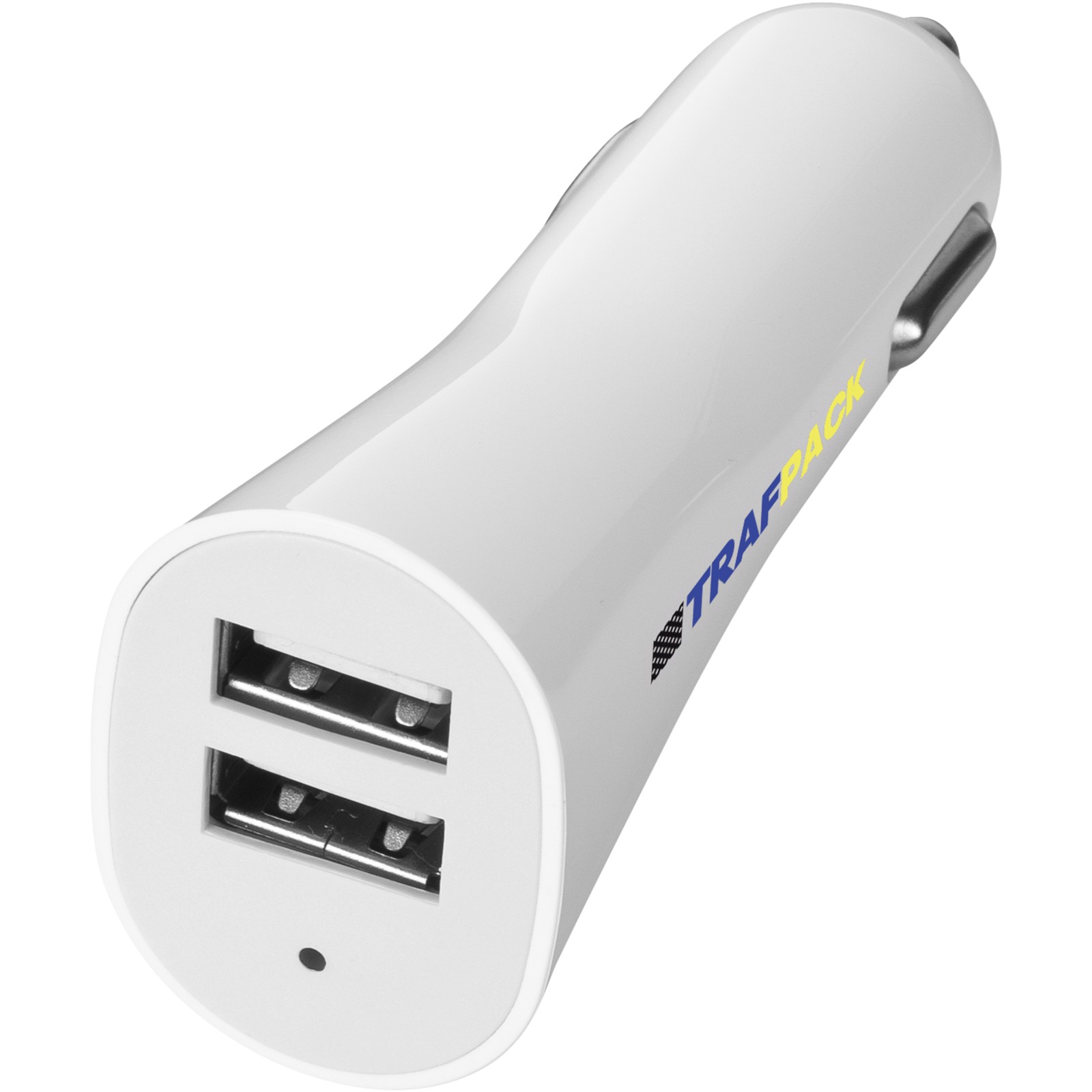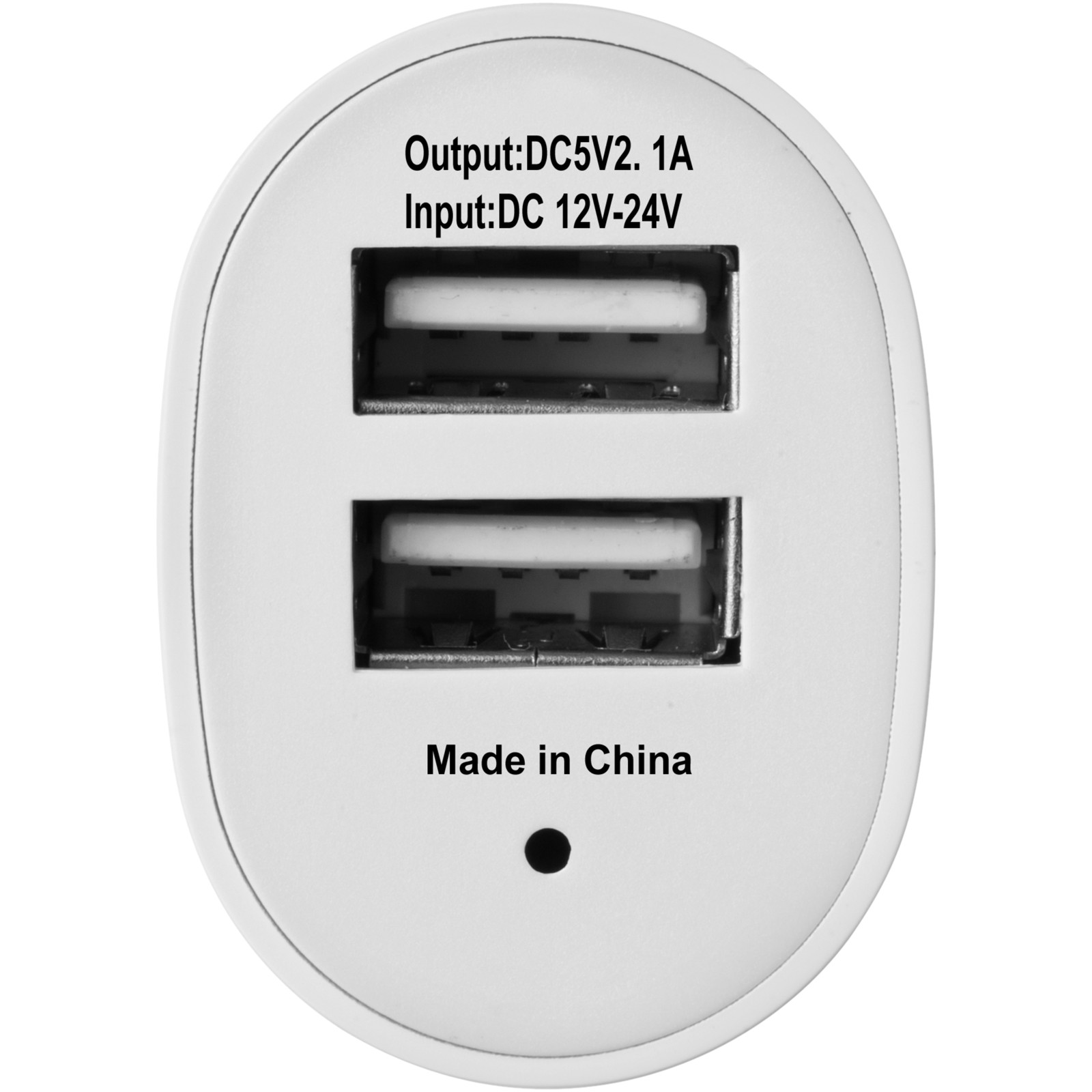Dual plug adapter. Plug into power outlet to charge personal devices. USB output: 5 Volts / 2.0 Amps. Input: 12V-24V. Suitable for cars and trucks.