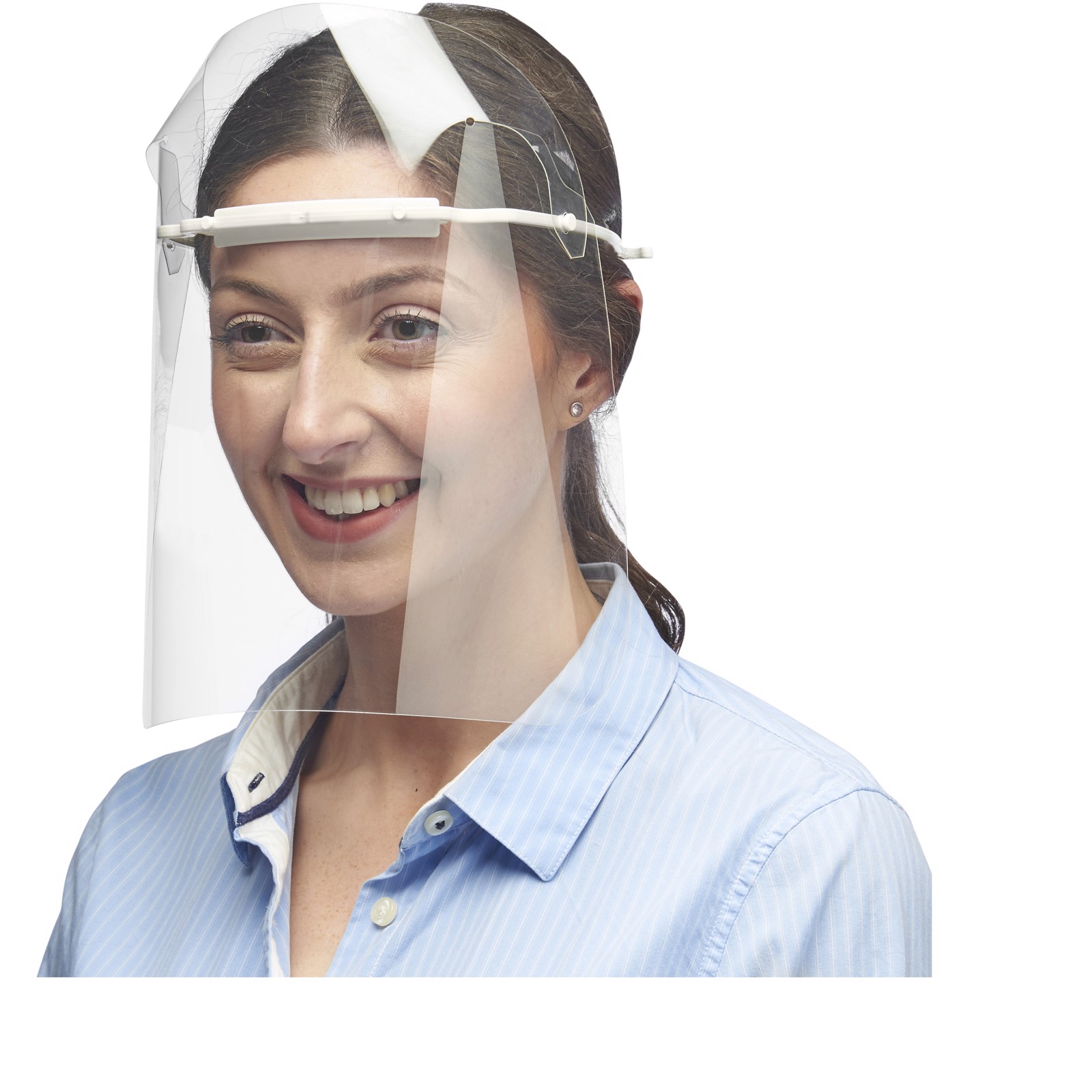 CE certified wraparound face visor, with extended height to cover the wearer's forehead. The frame contains Biomaster antimicrobial technology, which provides protection against the growth of harmful micro-organisms. The PET visor clips easily and securely to the frame. Made in the UK. Delivered flatpacked. CE marked in accordance with EU 2016/425.