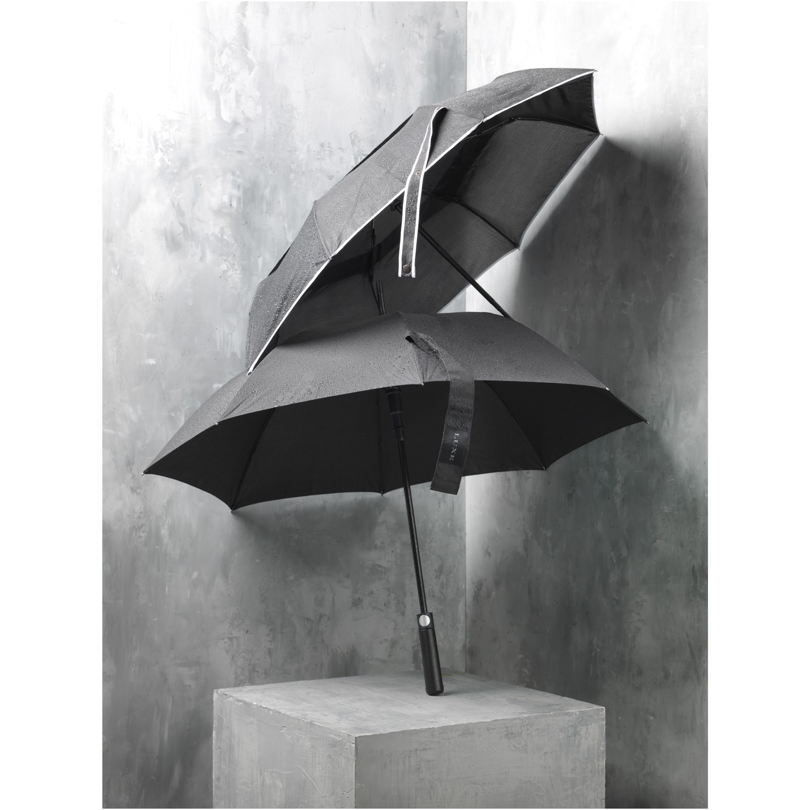 Automatic opening umbrella and windproof fiberglass frame. PU handle. Including storage pouch.