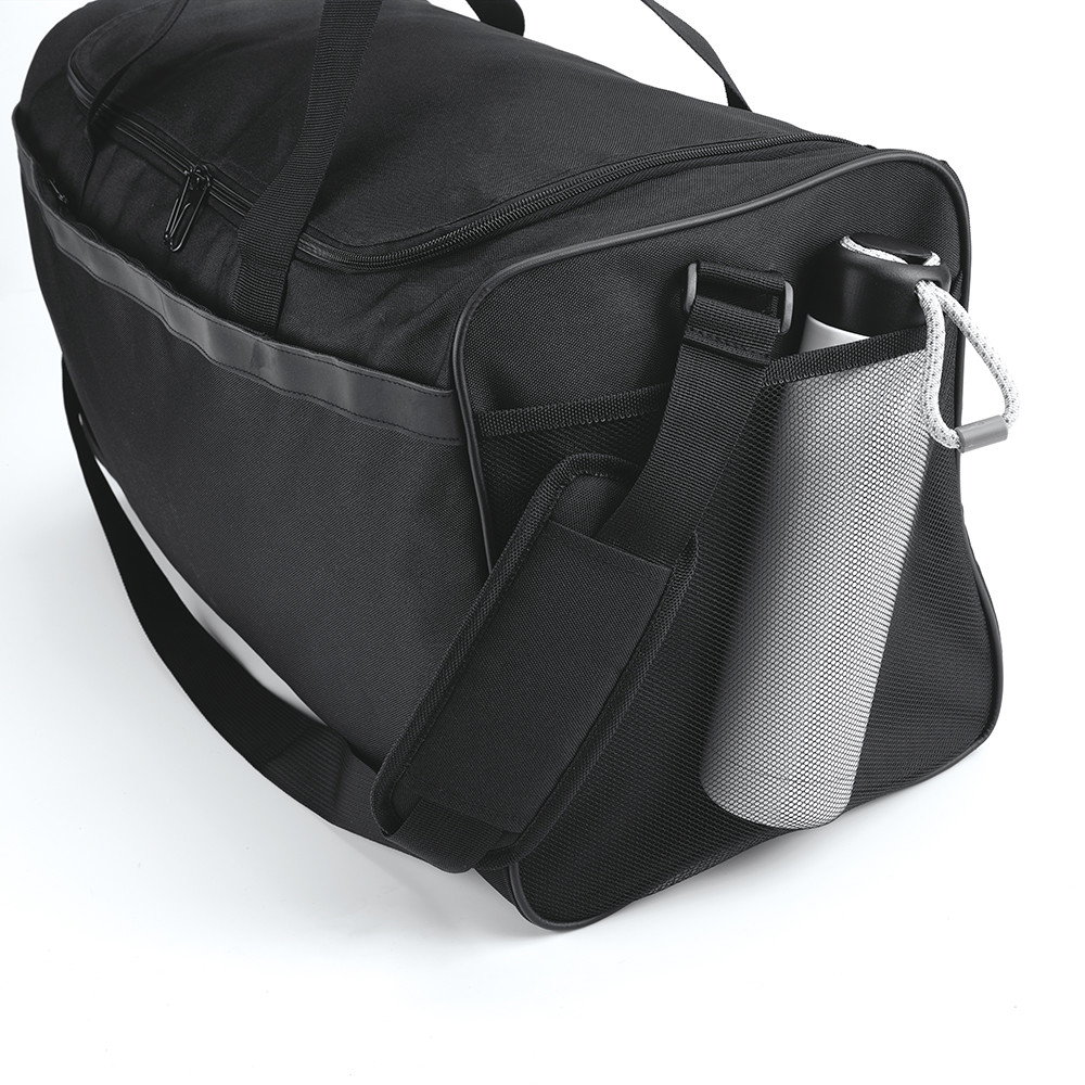 Sao Paulo L spacious 50L gym bag in rPET. This bag features one main compartment and a hidden zippered front pocket for secure storage. It includes an open side pocket and a mesh pocket on the other side for easy access to essentials. A contrast reflective strap adds style and visibility while concealing the front pocket. Finished with padded webbing handles and an adjustable shoulder strap with padding for comfortable carrying.