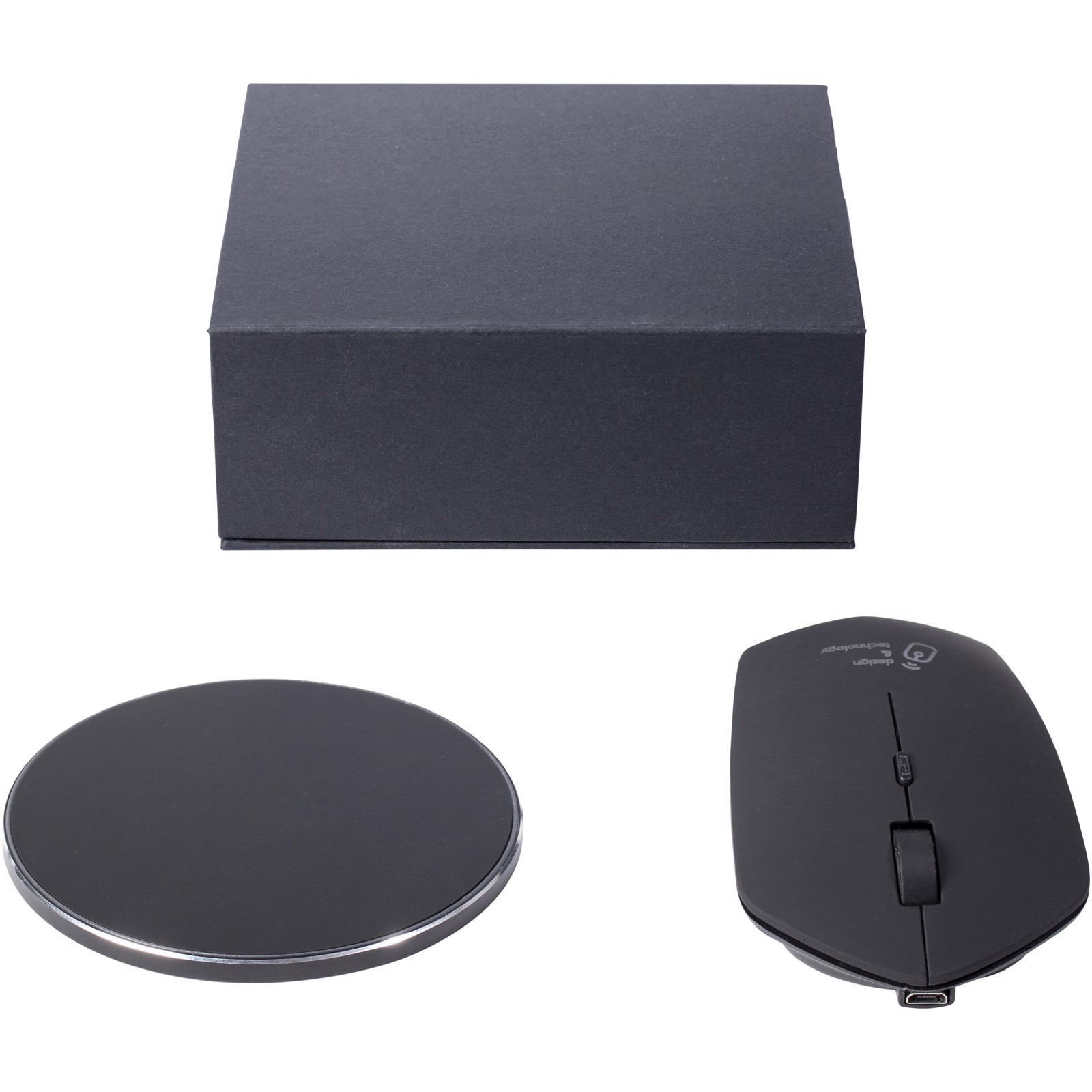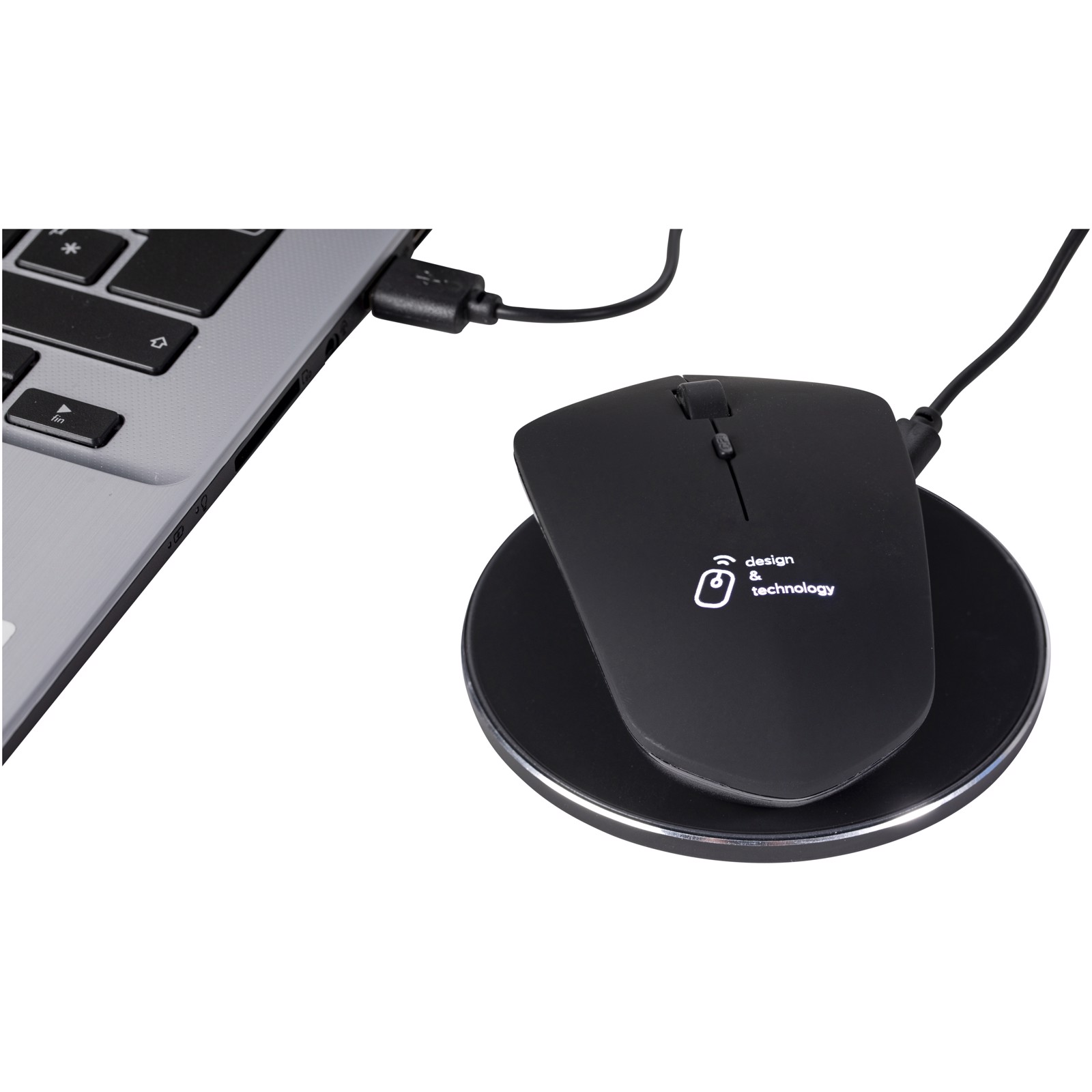 10W induction mouse and wireless base which can be used on the road as well as in the office thanks to the 30 cm extension cable (made of RPET). Patent EUROPE EUIPO.