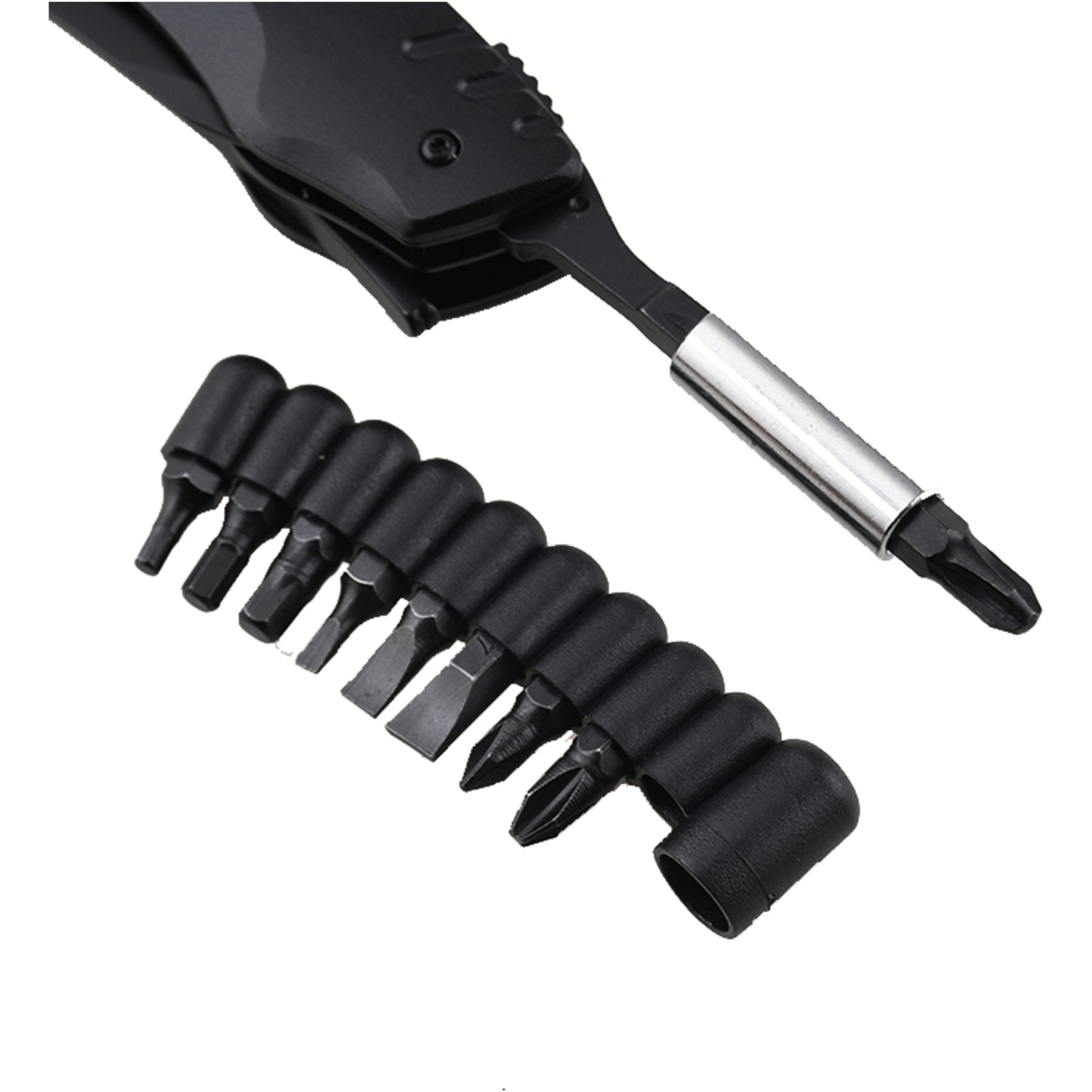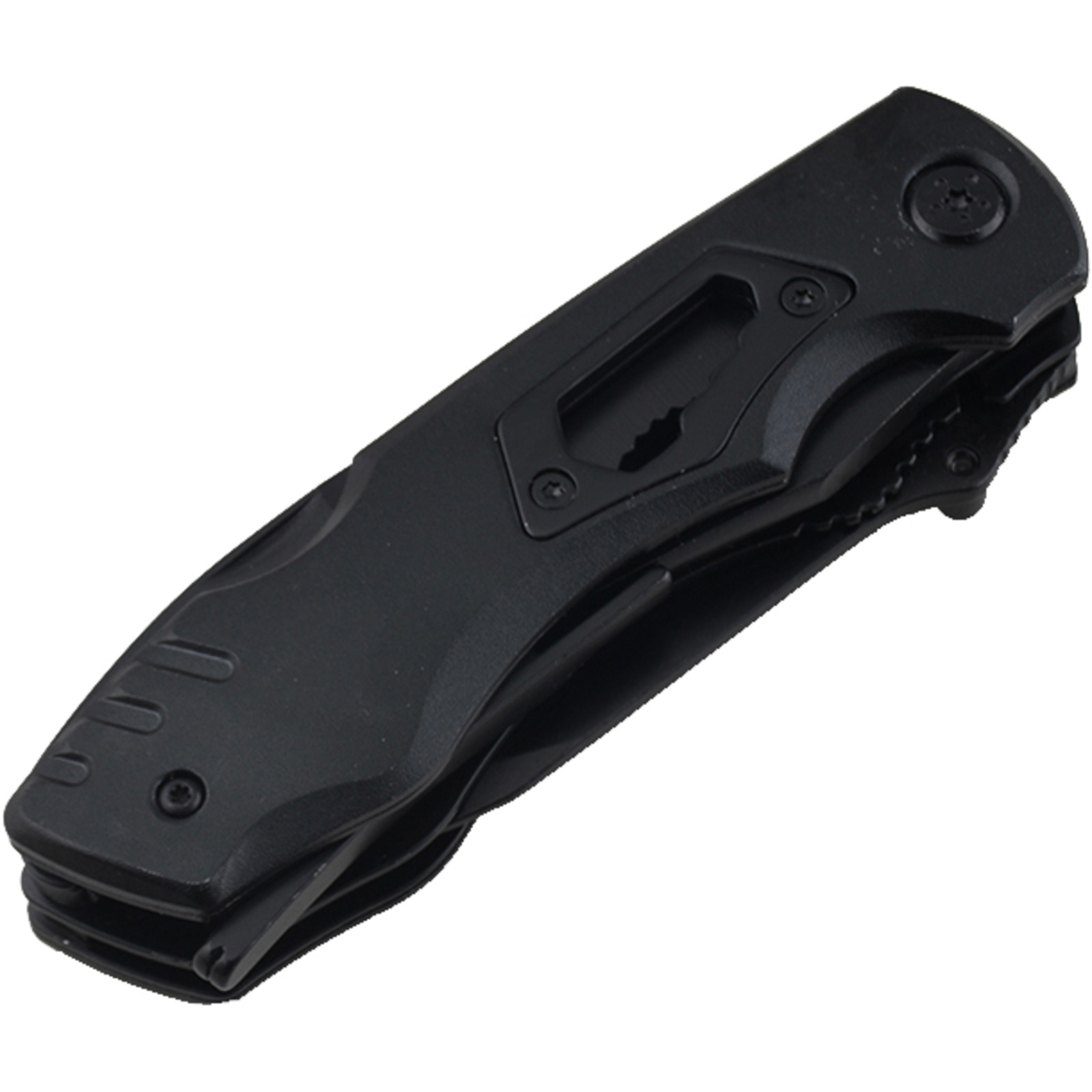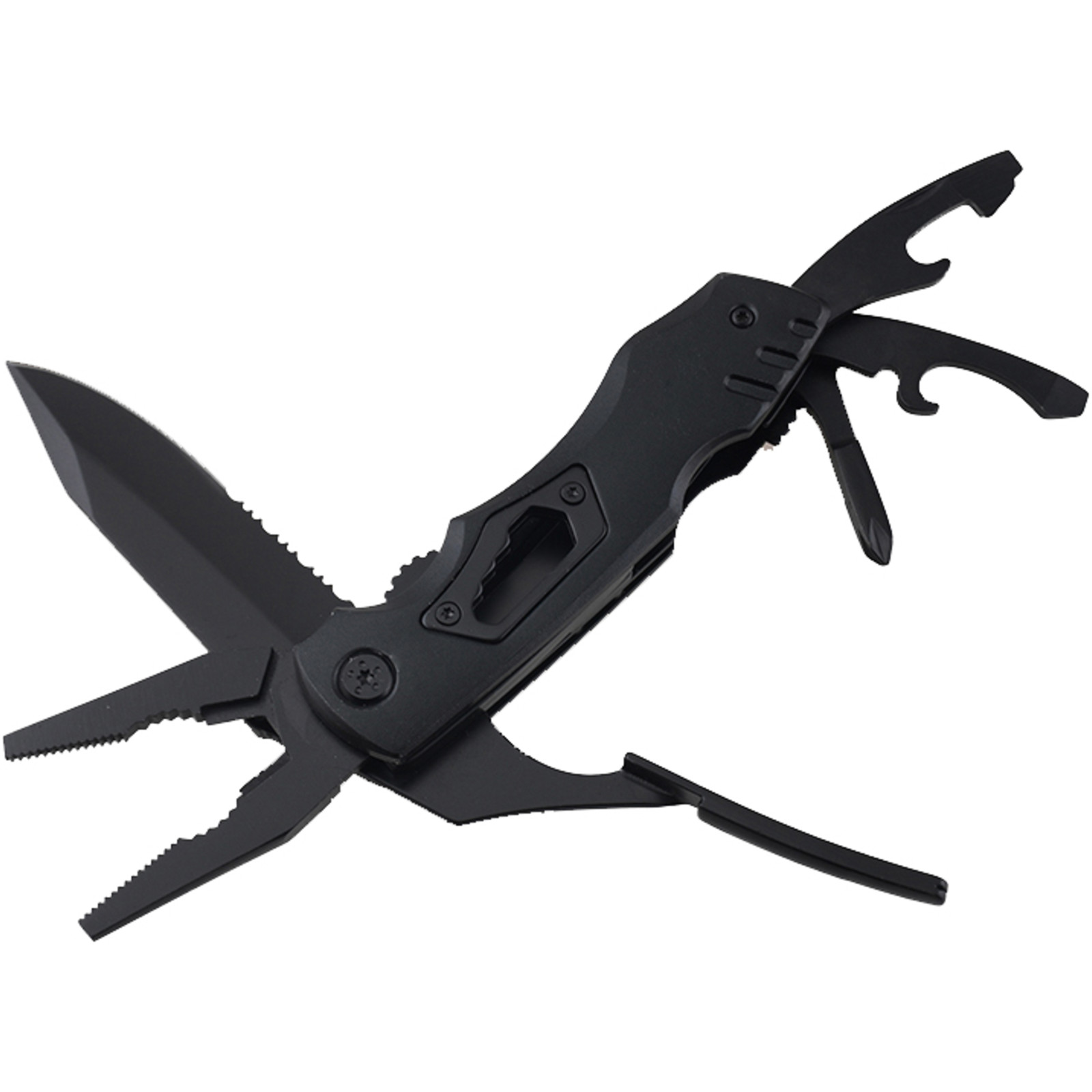 Practical and multifunctional pocket knife with 10 functions: needle nose pliers, regular pliers, cutter, sharp knife, serrated knife, philips screwdriver x2, can opener, slotted screwdriver and bottle opener. The compact size of this multitool knife makes it perfect to keep in a pocket, and it is also equipped with a durable nylon sheath for convenient carry on a belt or backpack. All tools have a black oxide coating, which is rust resistant and durable, and the handle has a carbon coating. When the knife is fully opened, the liner lock will secure the blade to prevent it from moving during use. To fold the knife, just press the liner lock lever to unlock the blade. Delivered in a cardboard gift box (14 x 6.7 x 5 cm).