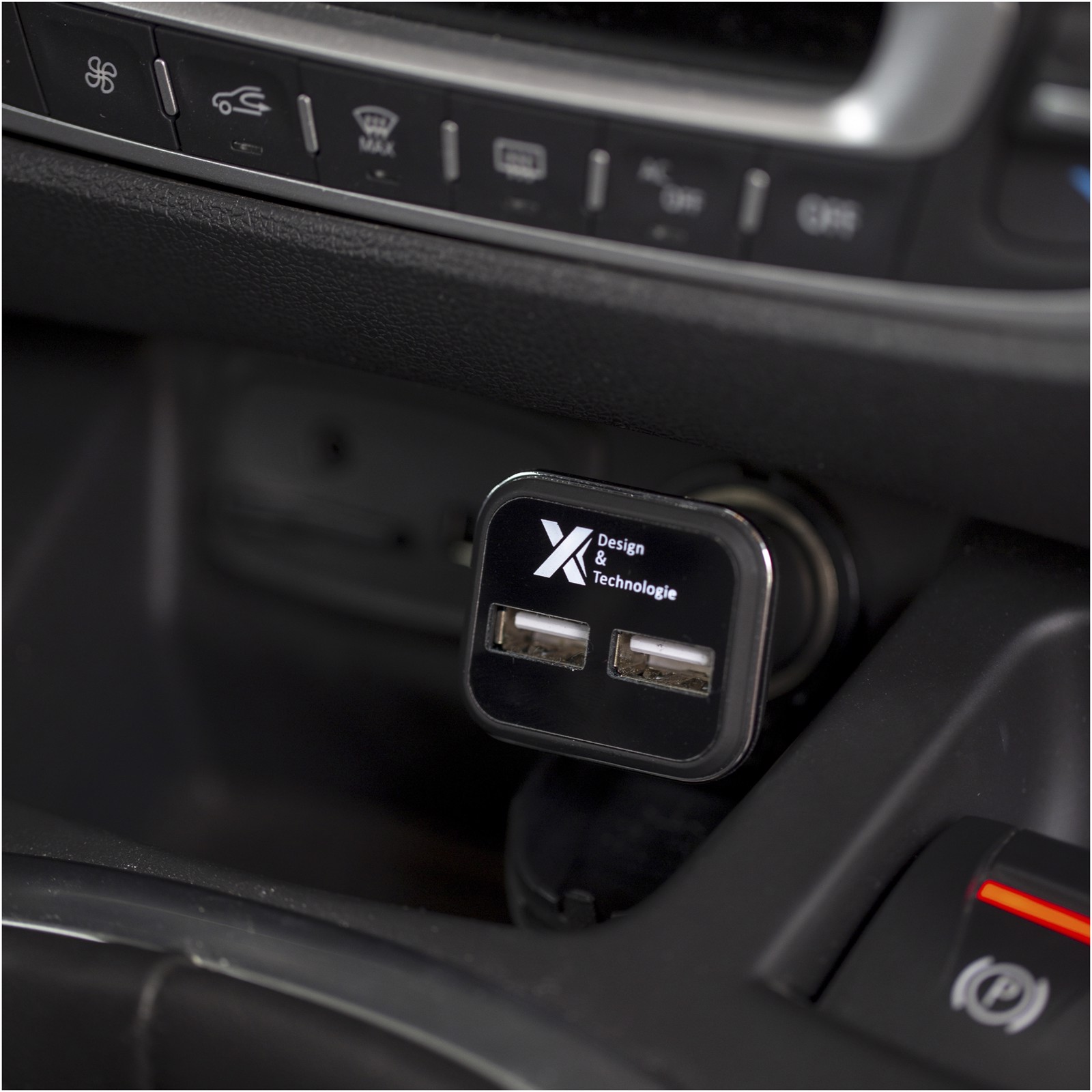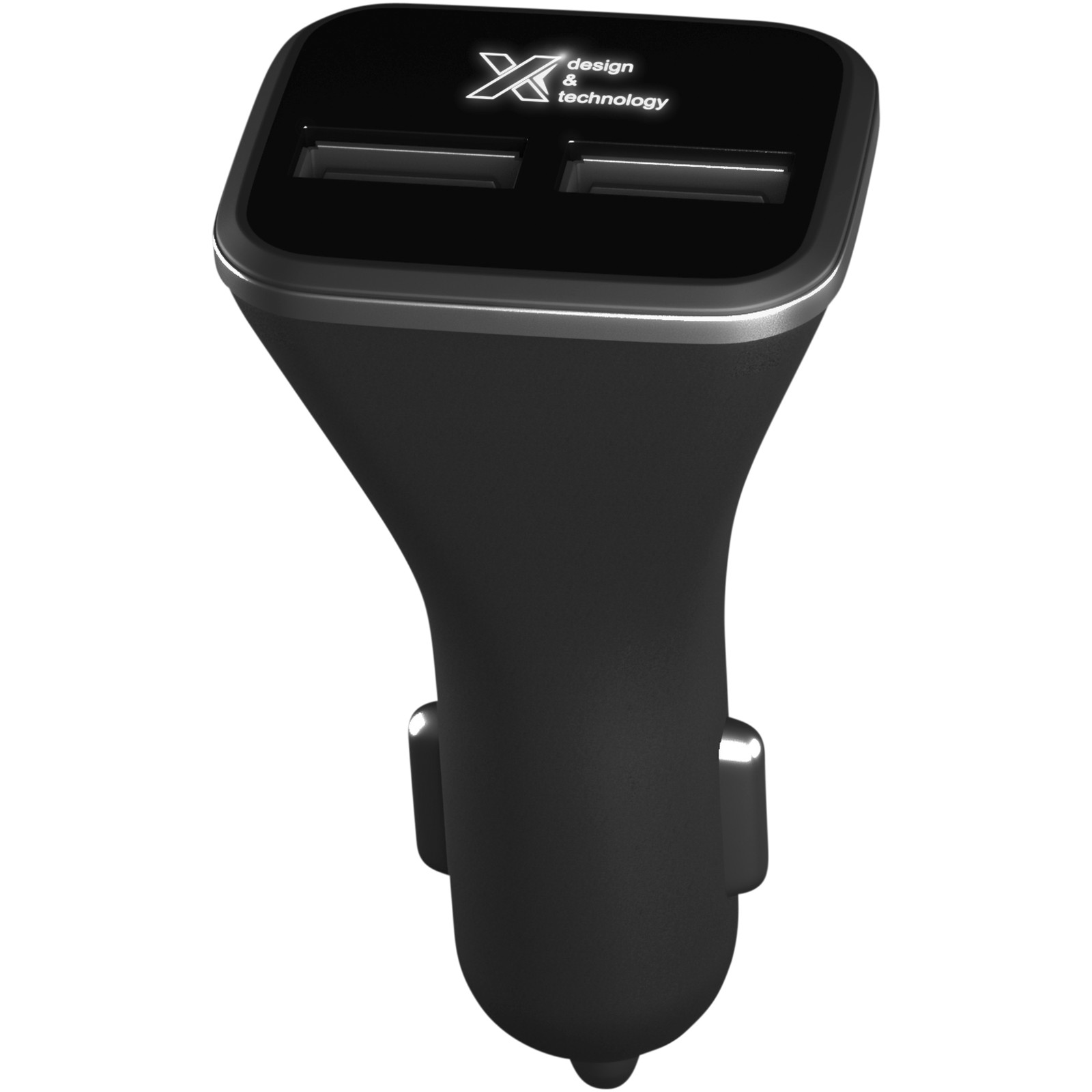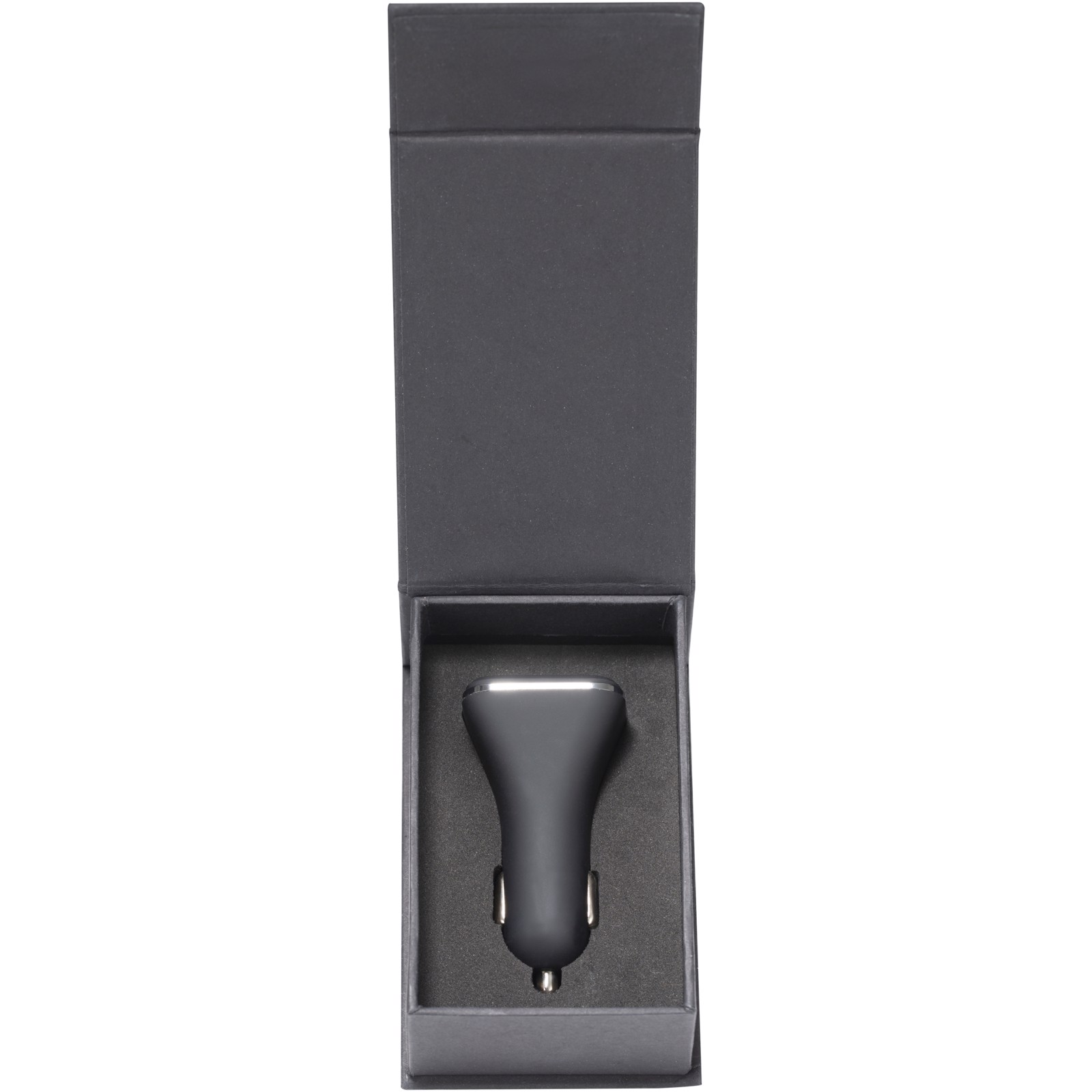 Light-up logo car charger with dual USB ports (including 2.1 A). DC Input: 12V ~ 24V. Output: Total 5 V/3.1 A. Each Output: 5V/2.1A. Comes with a gift box with magnetic closure, made out of recycled paper.