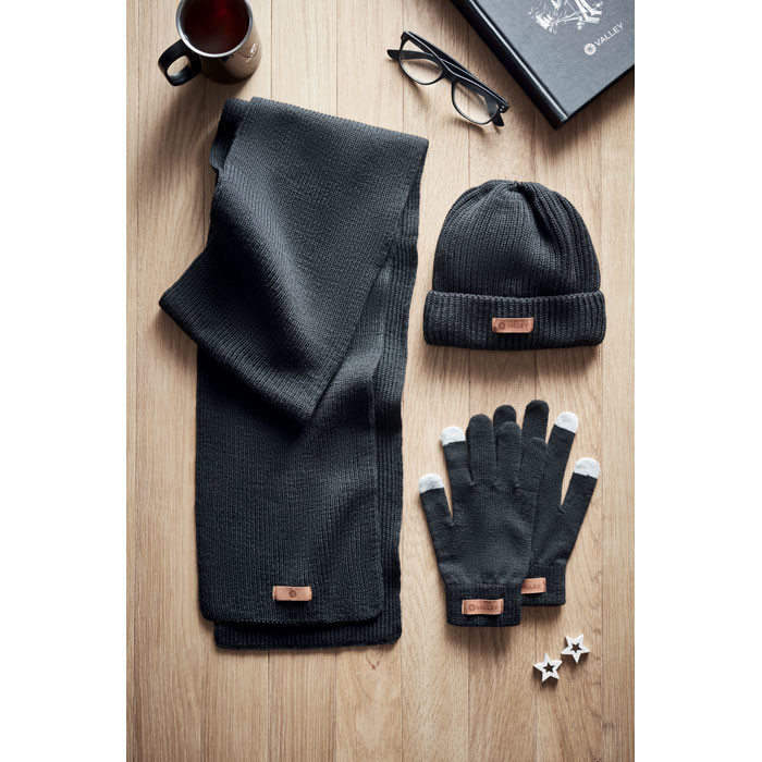3 piece winter set. Including RPET beanie, scarf and tactile gloves with label for printing area.