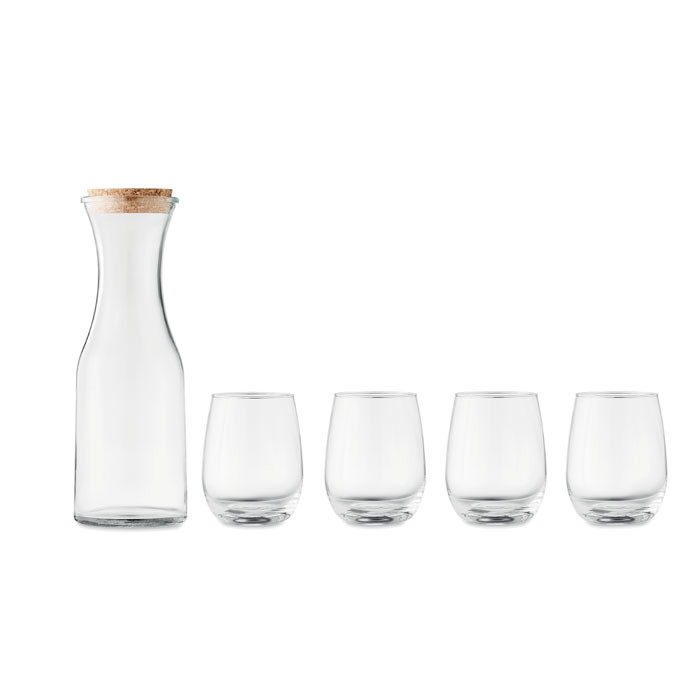 Recycled glass drink set. Including: Carafe (1L) with cork lid and 4 glasses (420 ml). Cork is 100% natural material. Due to its structural nature and surface porosity the final print result per item may have deviations.