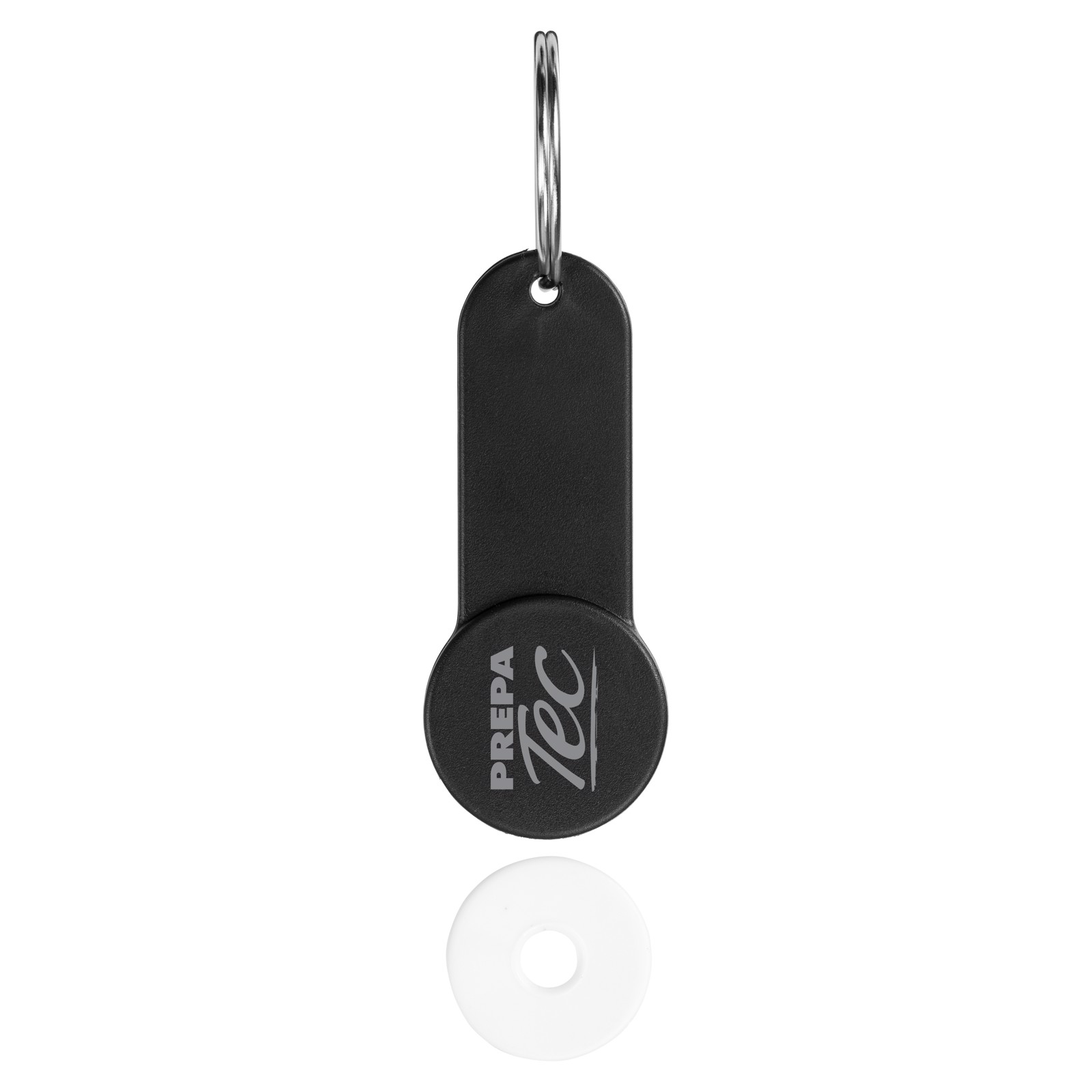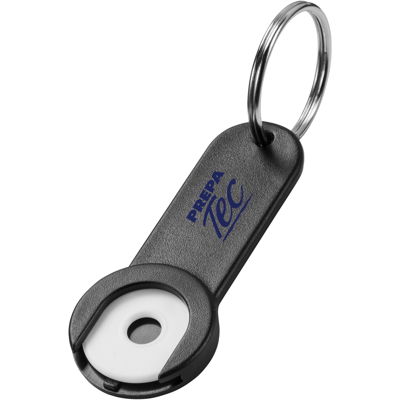 Shoppy coin holder keychain. 1 Euro sized plastic coin with Ø 6 mm hole and holder, ideal for when searching for a coin for a supermarket shopping trolley. Ø 30 mm metal split key ring. PS Plastic.