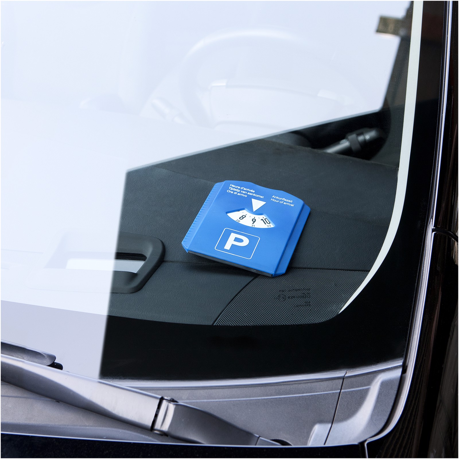 Parking disk with an ice scraper, rubber wiper, trolley coin and tire tread depth gauge. Disk has a large white logo area on the back. “Hour Of Arrival” text on disk cover listed in Dutch, English, French, German and Italian. Regulations may vary locally.