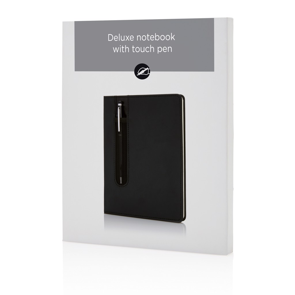 The perfect combo: A5 PU notebook with pen sleeve and a metal stylus pen. Packed in giftbox. 160 pages of 80g/m2 paper Inside.