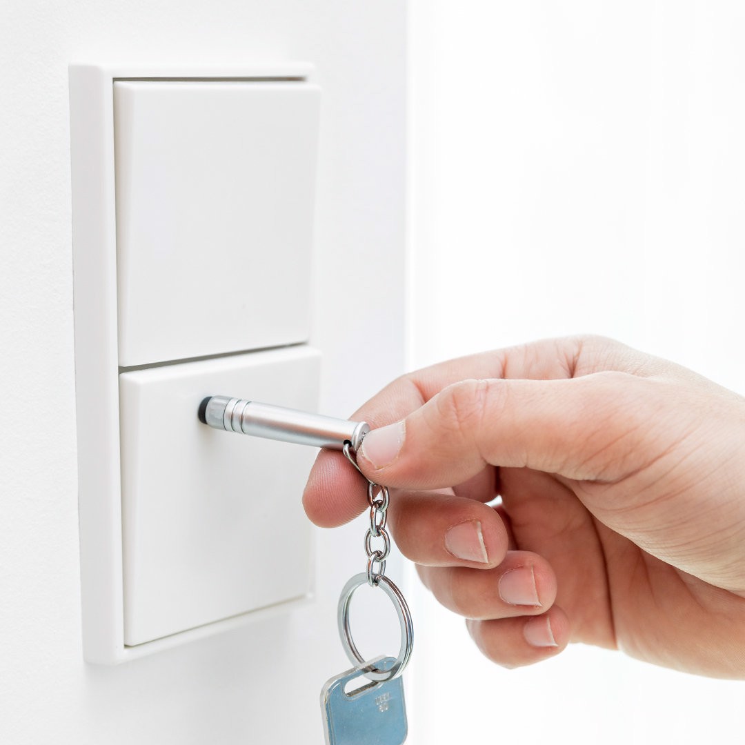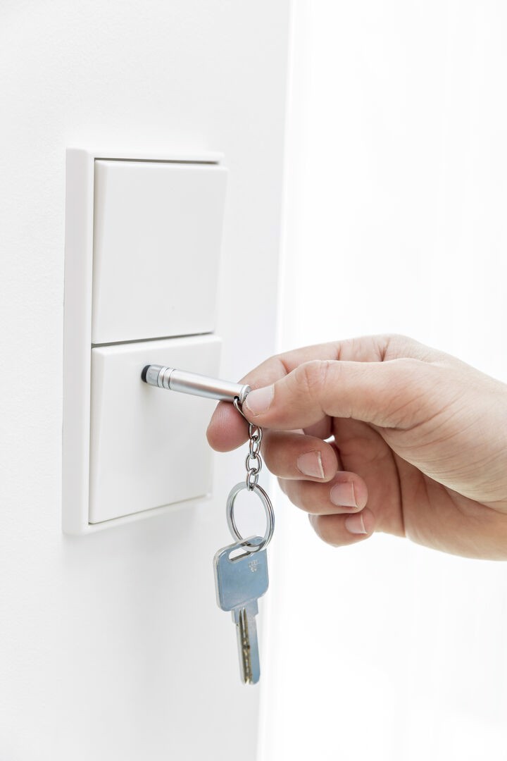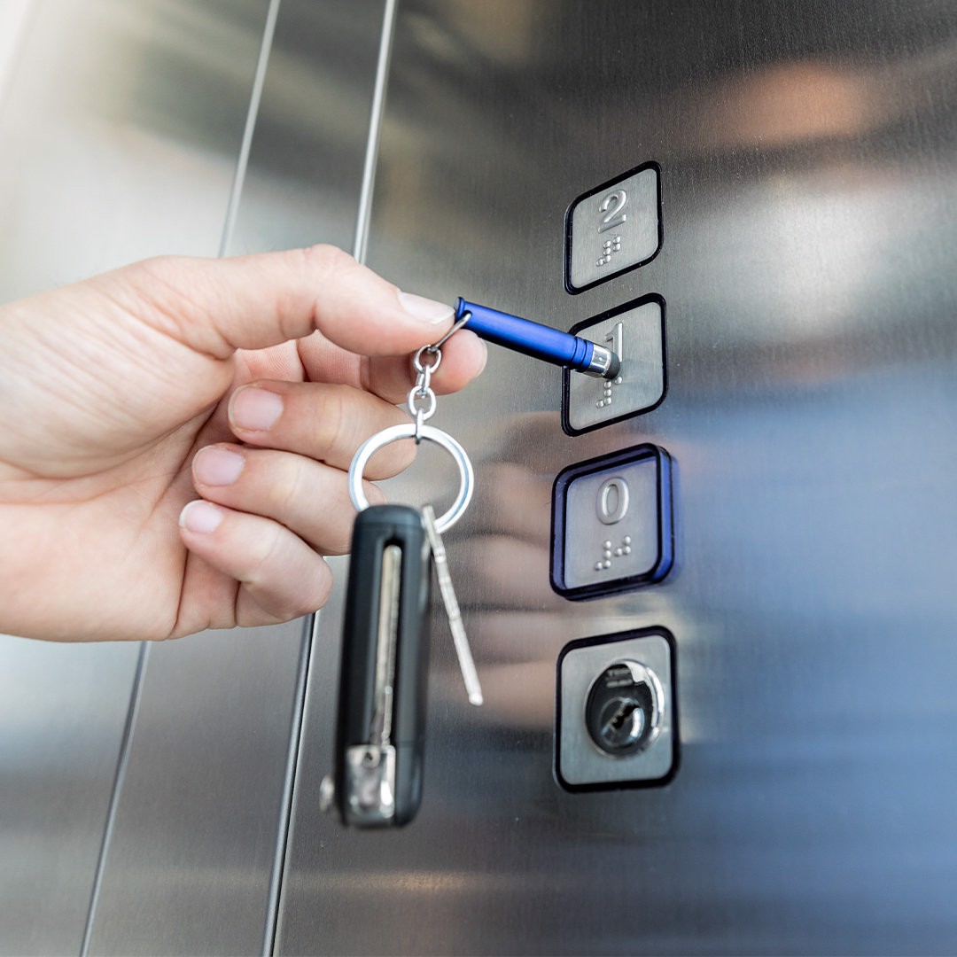Tactile security keychain pointer. Designed to encourage an hygienic and safety behavior in daily activities that require touching public surfaces (touch screens, ATM keyboards and payment terminals, lifts...). Easy to disinfect after each use and available in a wide range of colors.