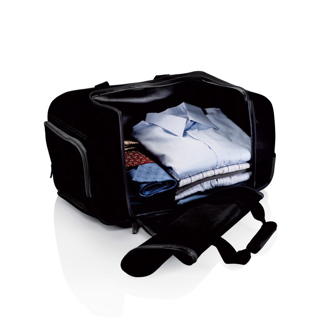 Padded microfibre and grey suede detail, 4 compartments, extra-large opening for easy access, separate trolley compartment and solid base, ca. 40L capacity, registered design®